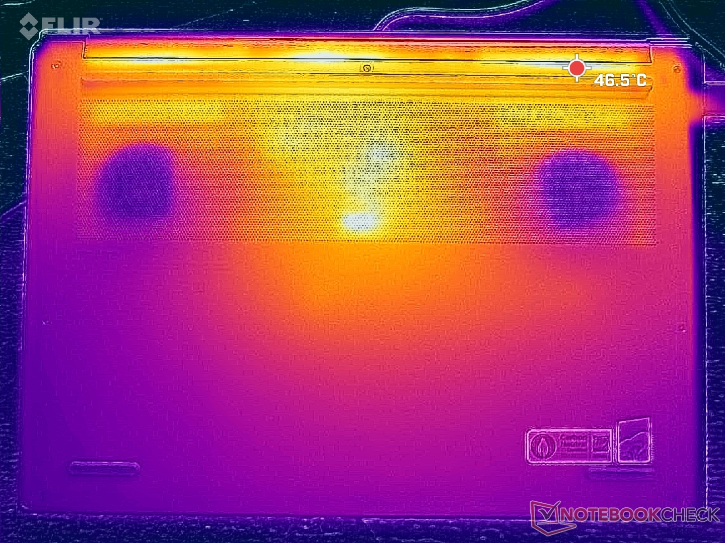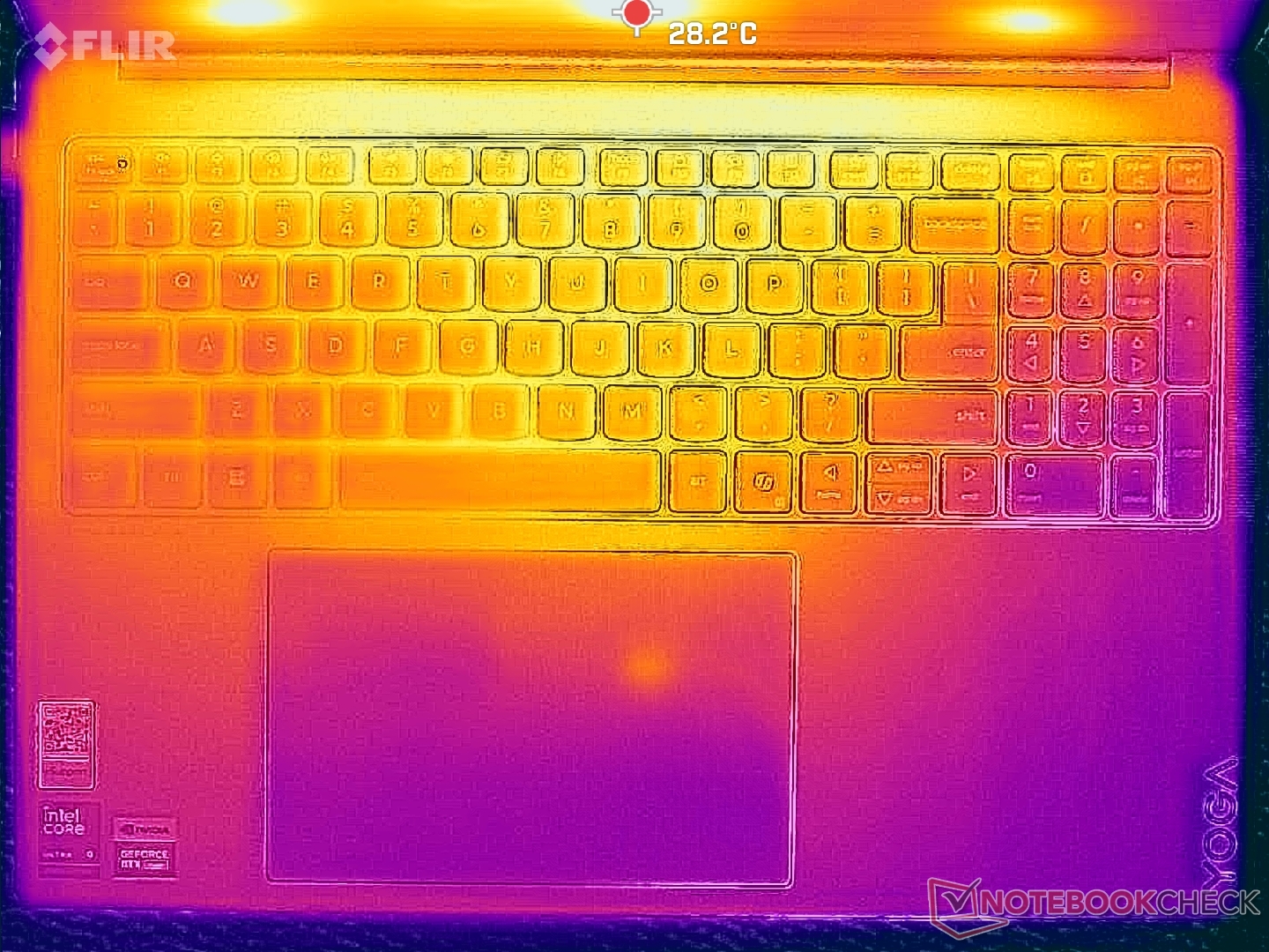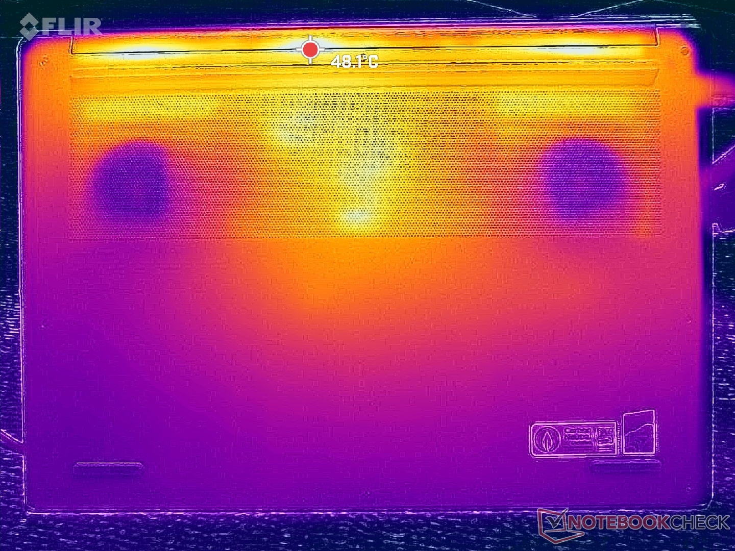 A felületi hőmérsékletek igényes terhelés esetén érezhetően hűvösebbek, mint amit az RTX 5070 konfiguráción mértünk. A Cyberpunk 2077 üresjáratában a forró pontok a billentyűzetfedélen és az alsó borításon valamivel több mint 35 C-ot, illetve 42 C-ot értek el, szemben a gyorsabb RTX 5070-es egység 42 C-os és 46 C-os értékével.