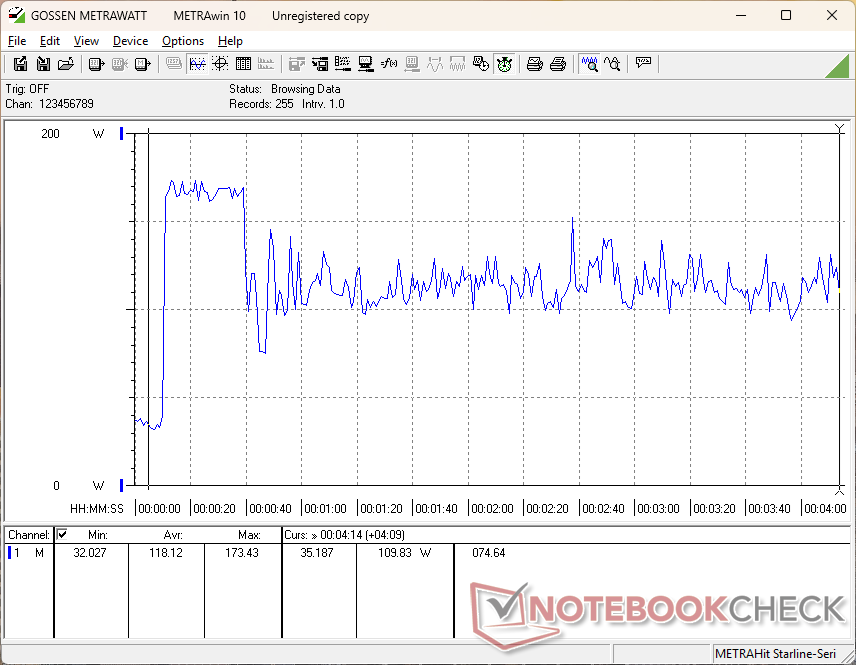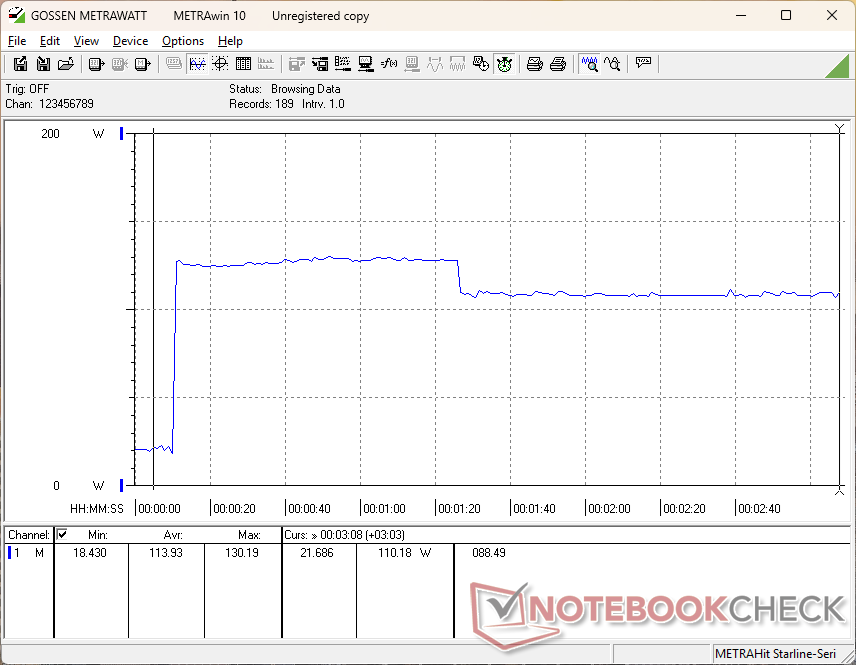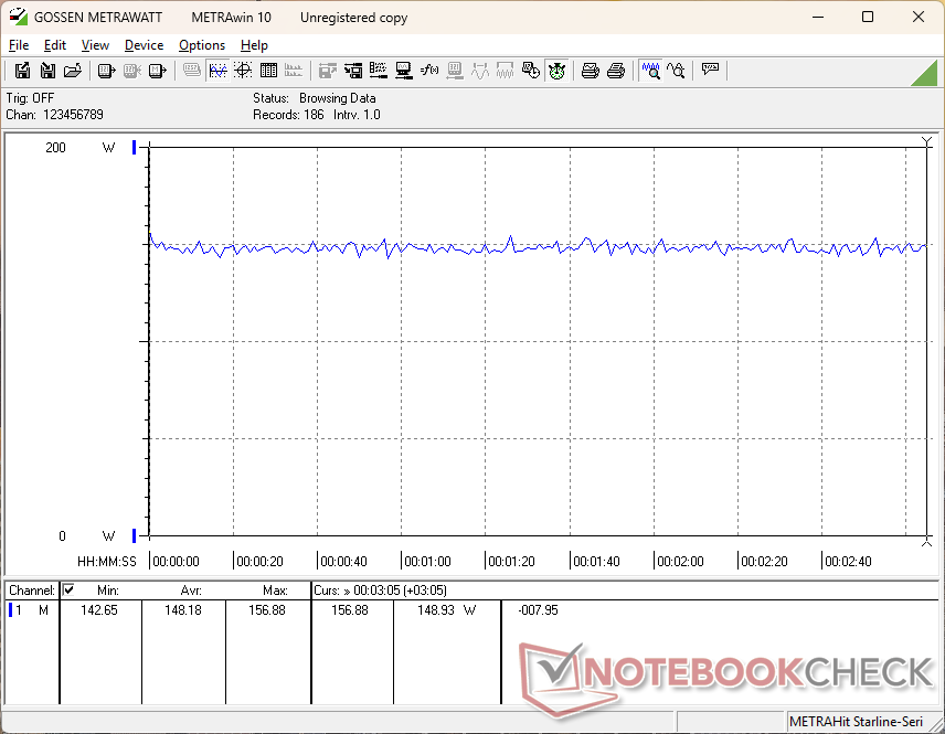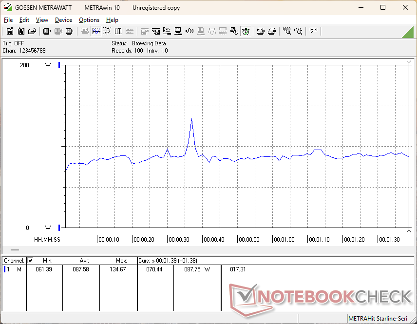 A fogyasztás akár 7 W is lehet, ha iGPU módban van, és a képernyő minimális fényerőre van állítva, vagy több mint 22 W, ha dGPU módban és maximális fényerőn van. Játék közben azonban a rendszer csak néhány wattal fogyaszt kevesebbet, mint a sokkal gyorsabb RTX 5060 vagy 5070 opciók. Az RTX 5060-as konfigurációra való frissítés például mindössze 6 százalékkal több energiát fogyasztana 20-30 százalékkal gyorsabb játékteljesítmény mellett.