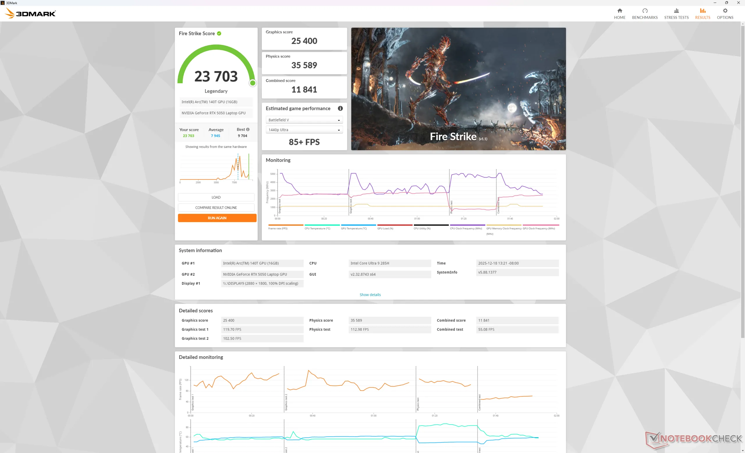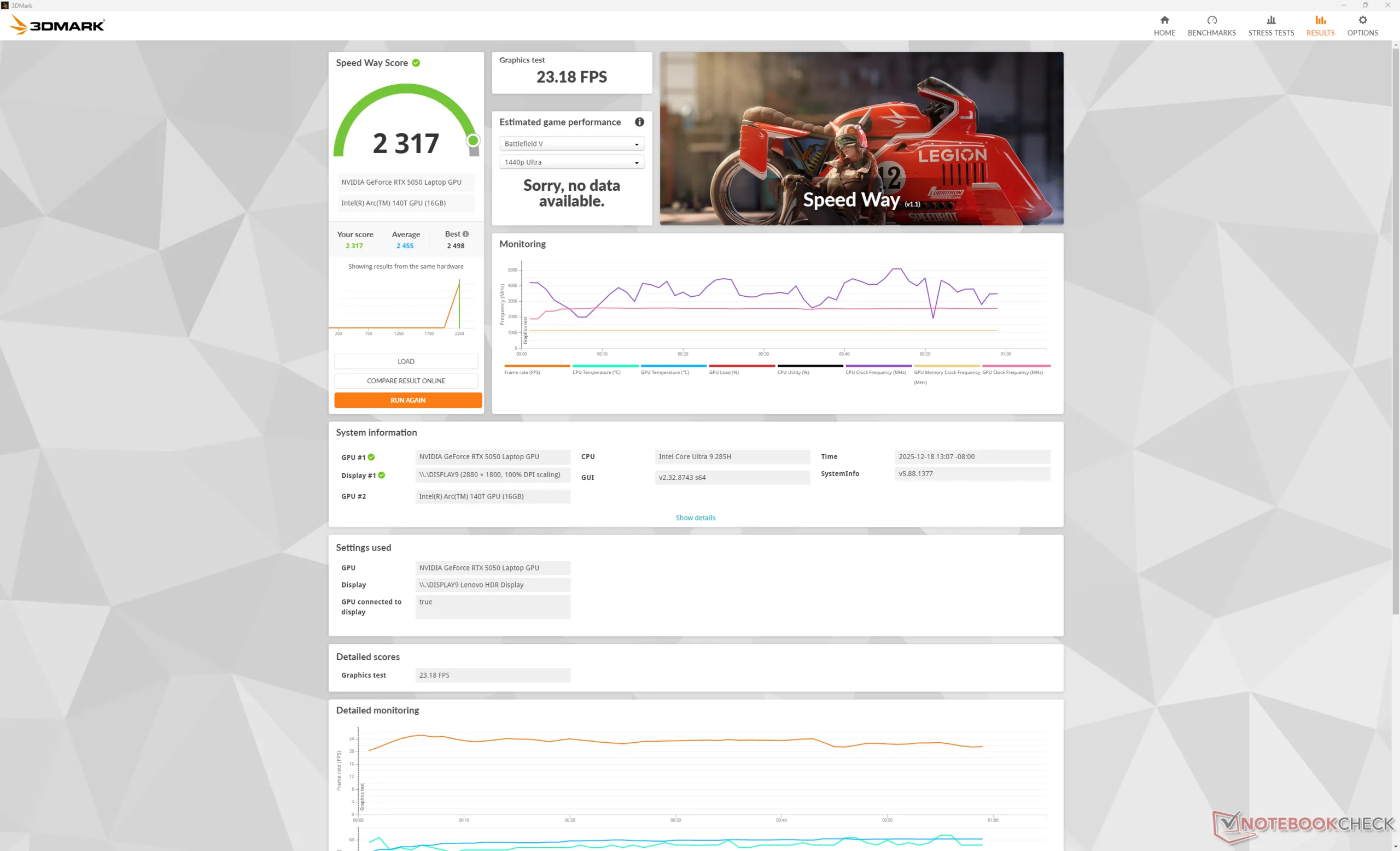 Még rosszabb, hogy az RTX 5050 konfiguráció választása nem feltétlenül jelent hosszabb akkumulátor-üzemidőt vagy csendesebb ventilátorokat játék vagy nagy terhelés esetén a lassabb teljesítmény ellenére. A Core Ultra 9 285H még az olcsóbb Core Ultra 7 255H-hoz képest sem nyújt nagy előrelépést, de az utóbbi CPU-val rendelkező SKU-kat sajnos nehezebb megtalálni az Egyesült Államokban. Az üzemi hőmérséklet talán hűvösebb, de ez a csekély előny elhalványul a hátrányok hosszabb listájához képest a sokkal értékesebb RTX 5060-as opcióval szemben.