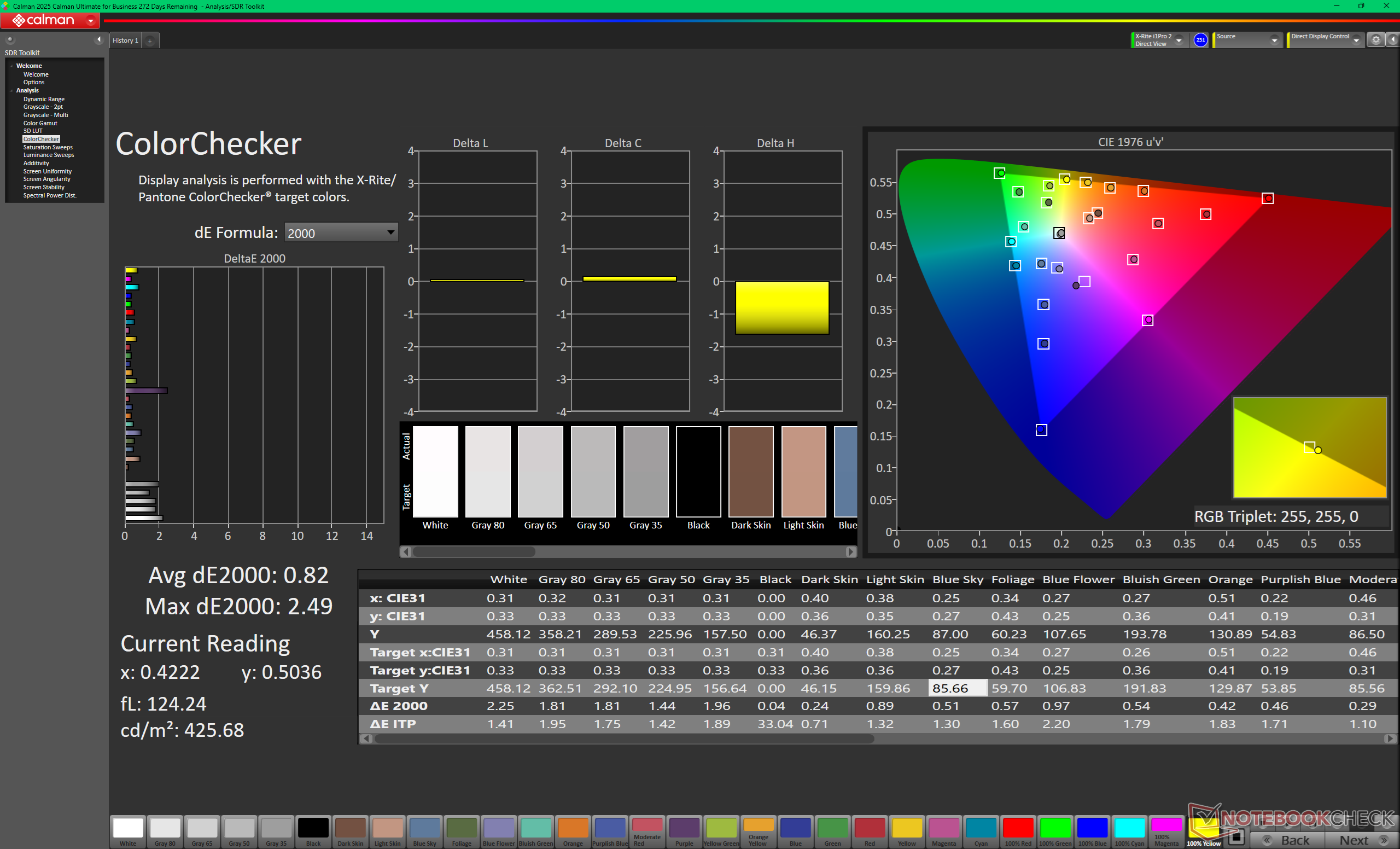 A kijelző jól kalibrált a P3 szabványhoz képest, az átlagos szürkeárnyalatos és színes deltaE értékek mindössze 0,6, illetve 2,21.