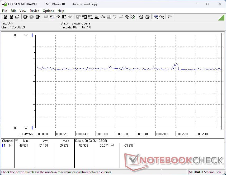 A kis méretű (~5,5 x 5,5 x 2,9 cm) 65 W-os USB-C AC-adapterből ideiglenesen maximum 69 W-ot tudunk mérni, amikor a CPU teljesen ki van terhelve. A gyorsabb Core Ultra X7-gyel rendelkező konfigurációk várhatóan általában valamivel nagyobb igénybevételt jelentenek a tapasztalatok alapján XPS 16 SKU-kkal.