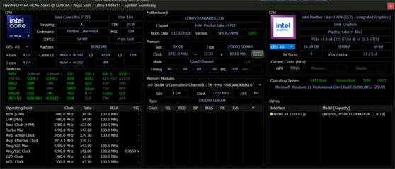 | Lenovo Yoga Slim 7 Ultra 14IPH11 Intel Core Ultra 7 355 ⎘ Intel Graphics 4 Xe3 Panther Lake iGPU ⎘ 32 GB Memória, 1024 GB SSD | Amazon: List Price: 1700 USD | 978 g | 13.9 mm | 14.00" 2880x1800 243 PPI OLED | |