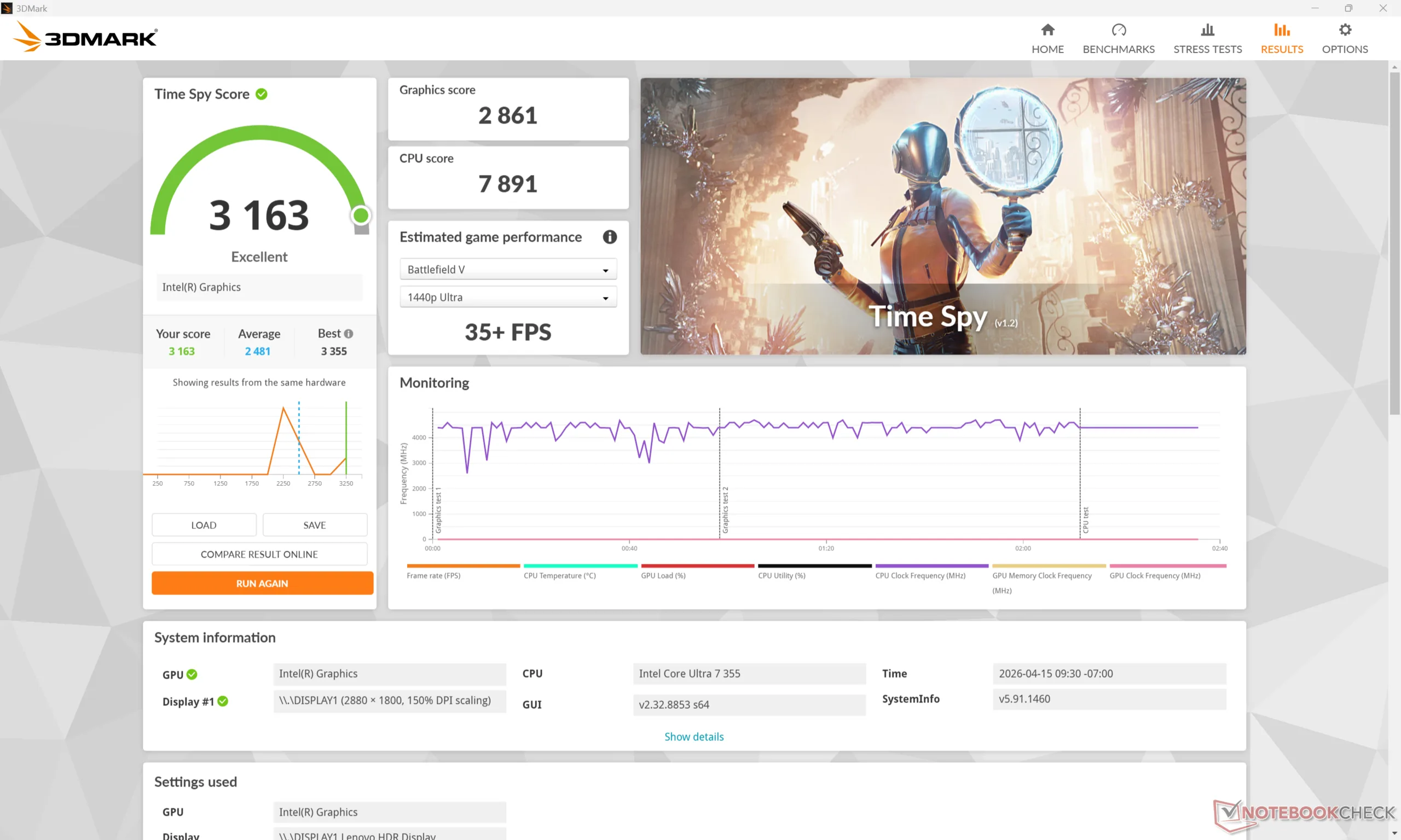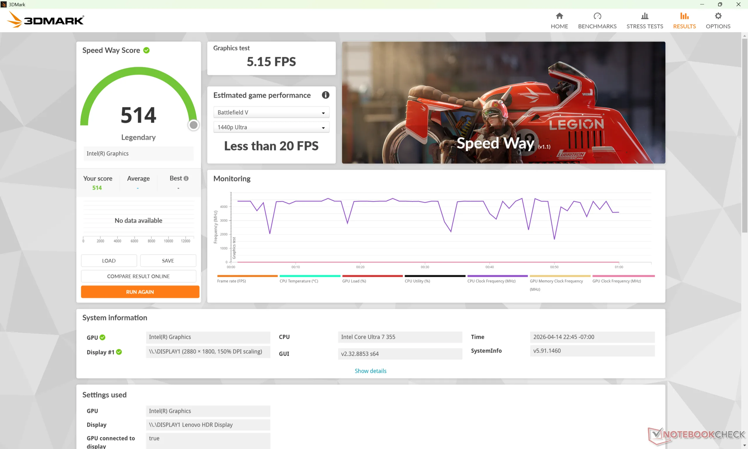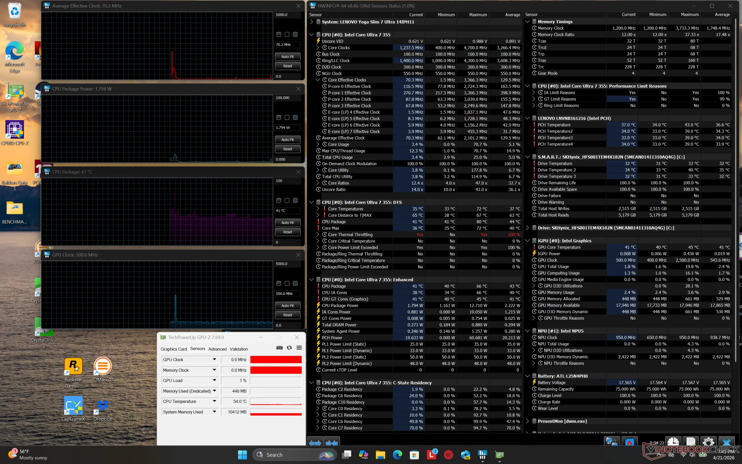 A Prime95 futtatása során a fogyasztás körülbelül 12 százalékkal kevesebb lenne, mint az AMD-üzemű Yoga Slim 7a 14 annak ellenére, hogy az Intel CPU 20 százalékkal gyorsabb, így a Ryzen AI 400 versenytársnál nagyobb teljesítményt nyújt wattonként. Hasonlóképpen, mind a teljesítmény, mind az egy wattra jutó teljesítmény ismét kissé az Intel javára változna, amikor a GPU-t terheljük.