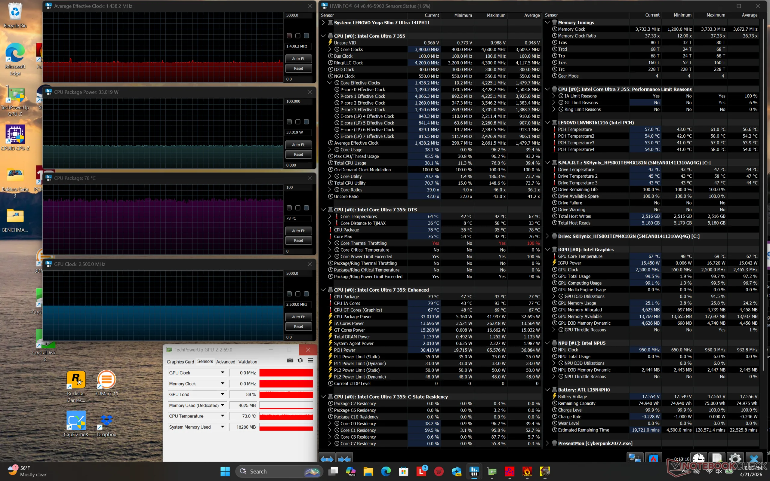 A GPU órajele és hőmérséklete a Cyberpunk 2077 futtatása során 2500 MHz-en, illetve 78 C-on stabilizálódna, ami majdnem pontosan megegyezik azzal, amit a konkurens modellnél rögzítettünk XPS 14 hasonló körülmények között.