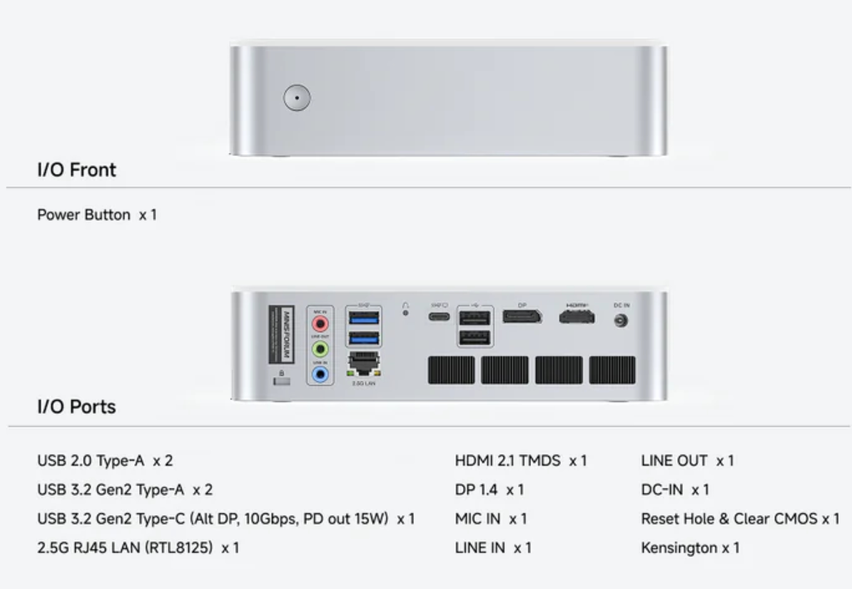 Emellett az M1-1295 támogatja a Bluetooth 5.2 és a Wi-Fi 6E csatlakozást a MediaTek MT7902 M.2 2230 modemen keresztül, valamint a 2,5 Gigabites Ethernetet a Realtek RTL8125 vezérlő segítségével. A mini-PC a hátoldalán számos más porttal is büszkélkedhet, köztük három videokimenettel, ahogy az alábbi képen is látható. Jelenleg az Amazonon valamivel olcsóbbak az előszerelt egységek, mint a Minisforum weboldalán. Ezzel szemben a Minisforum 329 dollárért árulja a csupasz egységeket közvetlenül a weboldalán. Más szóval a barebones egységek körülbelül 30%-kal olcsóbban futnak, mint előre konfigurált társaik.