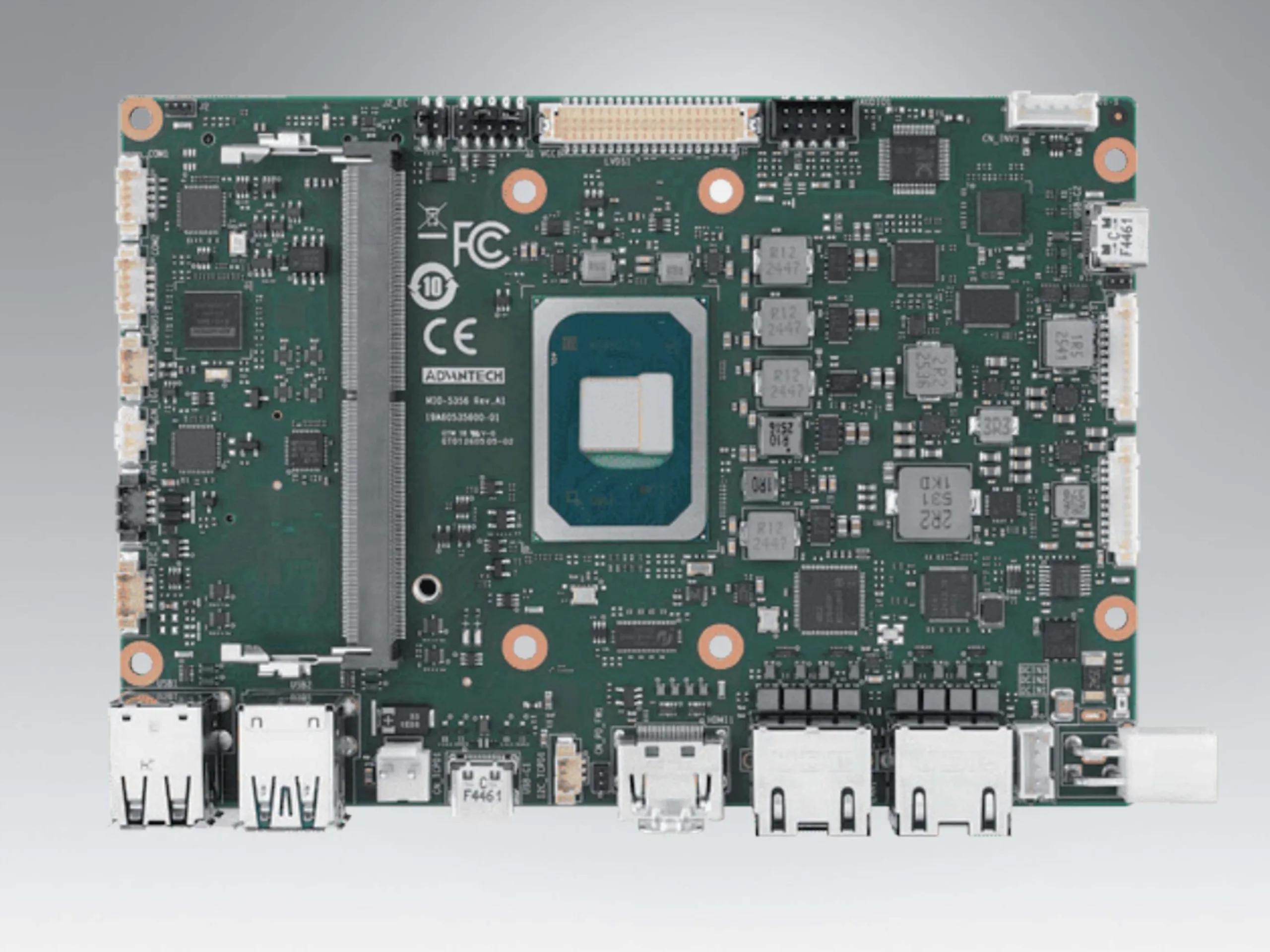 A Advantech MIO-5356 egy viszonylag kompakt alaplap integrált SoC-vel. A gyártó a rendszert egylapos számítógépként forgalmazza, bár valójában nem minden, a működéshez szükséges komponens integrált. Például az akár 64 GB kapacitású DDR5 RAM-ot még mindig be kell építeni. Nincs fedélzeti tároló sem, így a gyors tároláshoz jellemzően egy M.2 SSD-t kell használni.