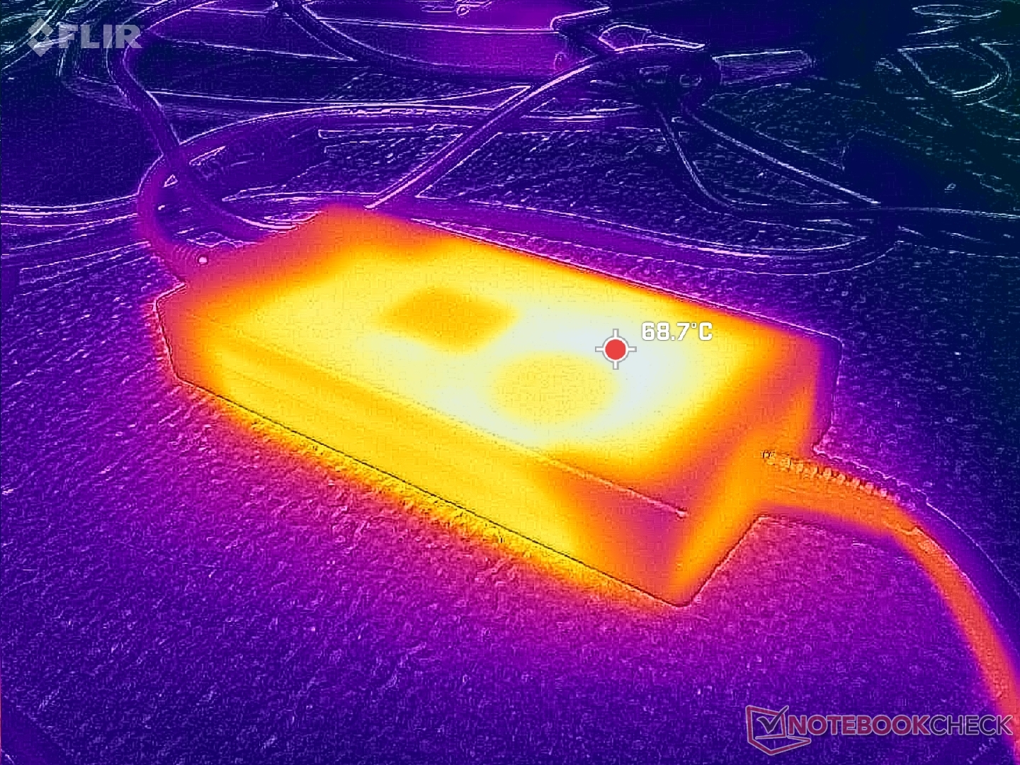 Továbbá a hálózati adapter is rendkívül melegszik, majdnem 70 C-ra (!), amikor olyan igényes terhelések, mint a játékok futnak. Összehasonlításképpen, a fent említett Blade 18 terhelés alatt 50 C alatt marad.