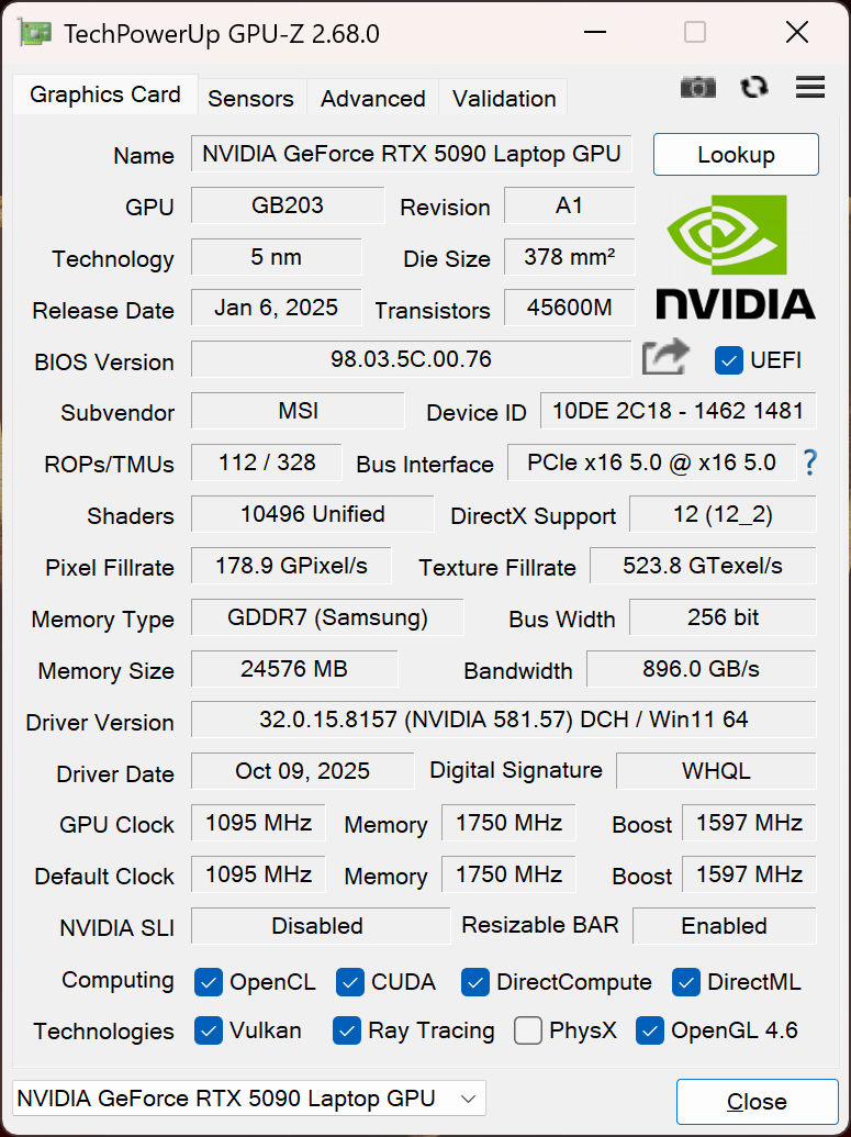 | Alienware 18 Area-51 Intel Core Ultra 9 275HX ⎘ NVIDIA GeForce RTX 5090 Laptop ⎘ 64 GB Memória | Amazon: $2,999.99 List Price: 4400 USD | 4.2 kg | 24.32 mm | 18.00" 2560x1600 168 PPI IPS | |
