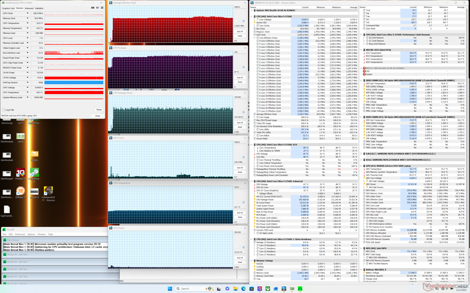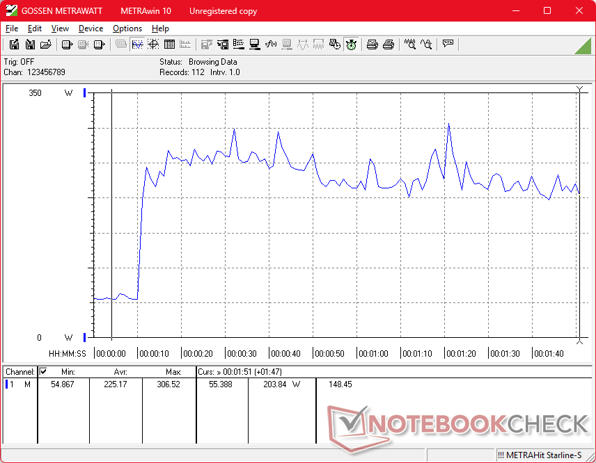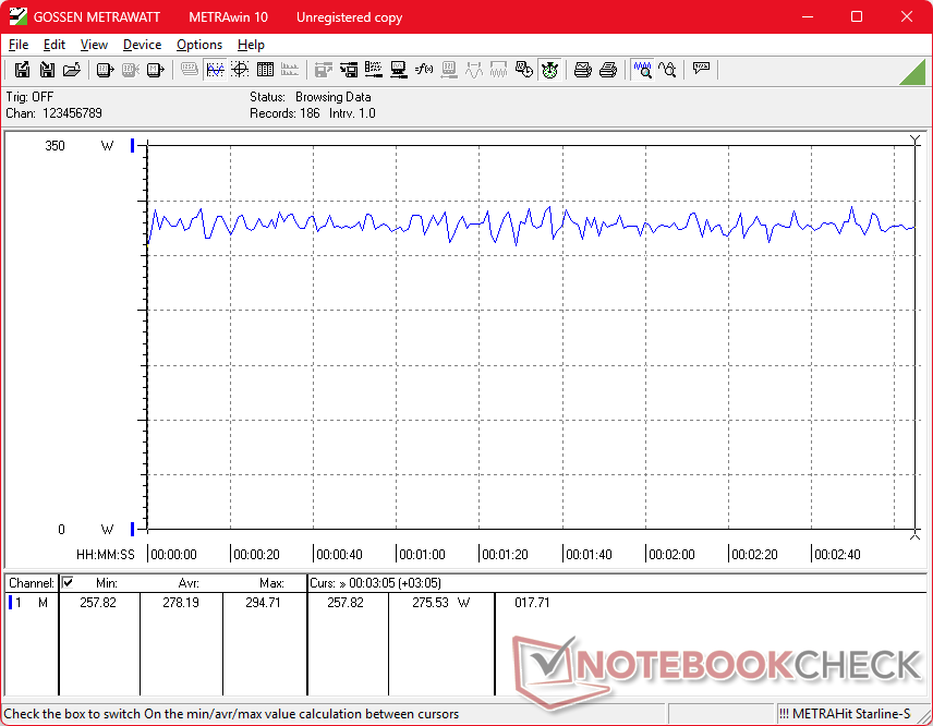 A 280 W-os hálózati adapter a rendszer egyik fő vitapontja, mivel játék közben rendszeresen 270 W-ot vagy annál többet húz, ami arra utal, hogy a 280 W nem biztos, hogy elég a teljes teljesítményhez. Nemcsak, hogy terhelés alatt rendkívül felmelegedhet, de a CPU, a GPU és a játék benchmarkok gyakran valamivel lassabbak, mint más hasonló processzorkonfigurációjú laptopoké. Az MSI valószínűleg úgy döntött, hogy a kisebb és hordozhatóbb 280 W-os hálózati adapter megéri azt a kis kompromisszumot a töltési sebesség és a teljesítmény terén, amelyet egy nagyobb, 300+ W-os adapter biztosíthatott volna.