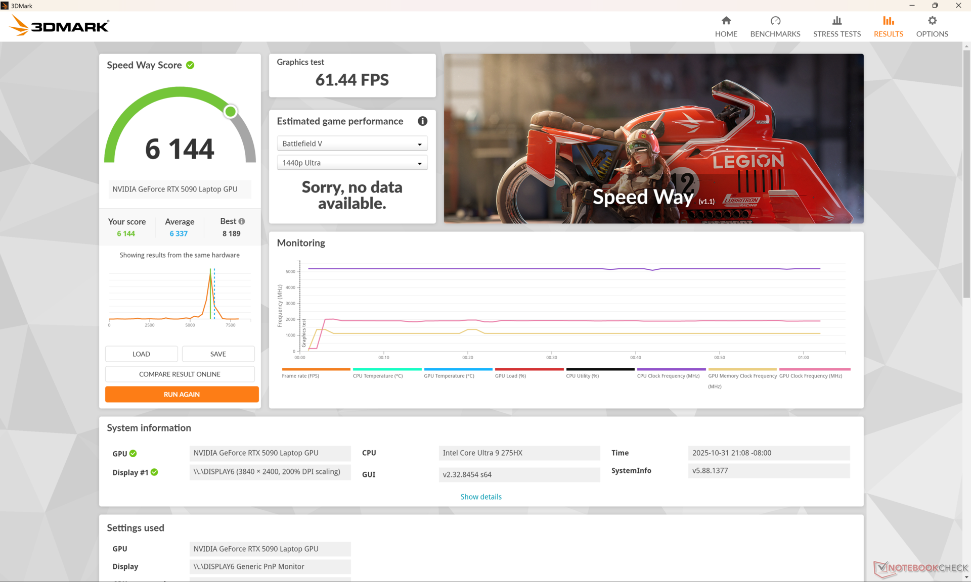 A Cyberpunk 2077 futtatása 18 százalékkal kevesebb energiát fogyaszt, mint az azonos CPU-val és GPU-val konfigurált Razer Blade 18 esetében. A teljesítmény azonban az MSI-vel is valamivel lassabb lenne, ahogy azt a GPU teljesítménye szakaszban említettük.