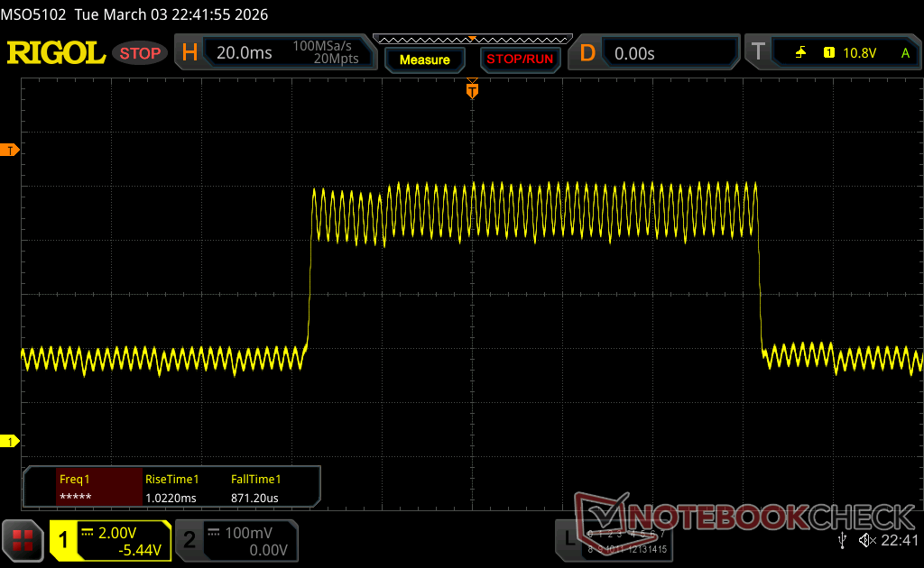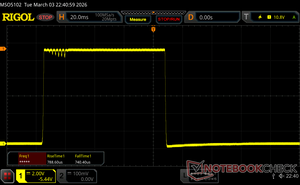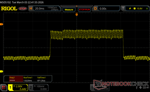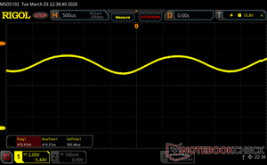 A kijelző háttérvilágítása 480 Hz-en villog (a legrosszabb esetben, pl. PWM használatával) Villódzás észlelve a 100 % vagy annál kisebb fényerő-beállításnál. E fényerő-beállítás felett nem lehet villogás vagy PWM. A 480 Hz frekvenciája viszonylag magas, így a legtöbb PWM-re érzékeny felhasználó nem észlel semmilyen villogást. Vannak azonban jelentések, amelyek szerint egyes felhasználók még mindig érzékenyek a PWM-re 500 Hz-en és magasabb frekvencián, ezért ügyeljen rá. Összehasonlításképpen: az összes tesztelt eszköz 53 %-a nem használja a PWM-et a kijelző elsötétítésére. Ha PWM-et észleltek, akkor átlagosan 7996 (minimum: 5 - maximum: 343500) Hz-t mértek. | |||