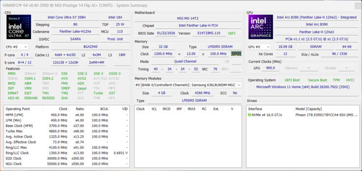 | MSI Prestige 14 Flip AI+ 2026 Intel Core Ultra X7 358H ⎘ Intel Arc B390 12 Xe3 Panther Lake iGPU ⎘ 32 GB Memória, 1000 GB SSD | List Price: 1549€ | 1.4 kg | 13.9 mm | 14.00" 1920x1200 162 PPI OLED | |