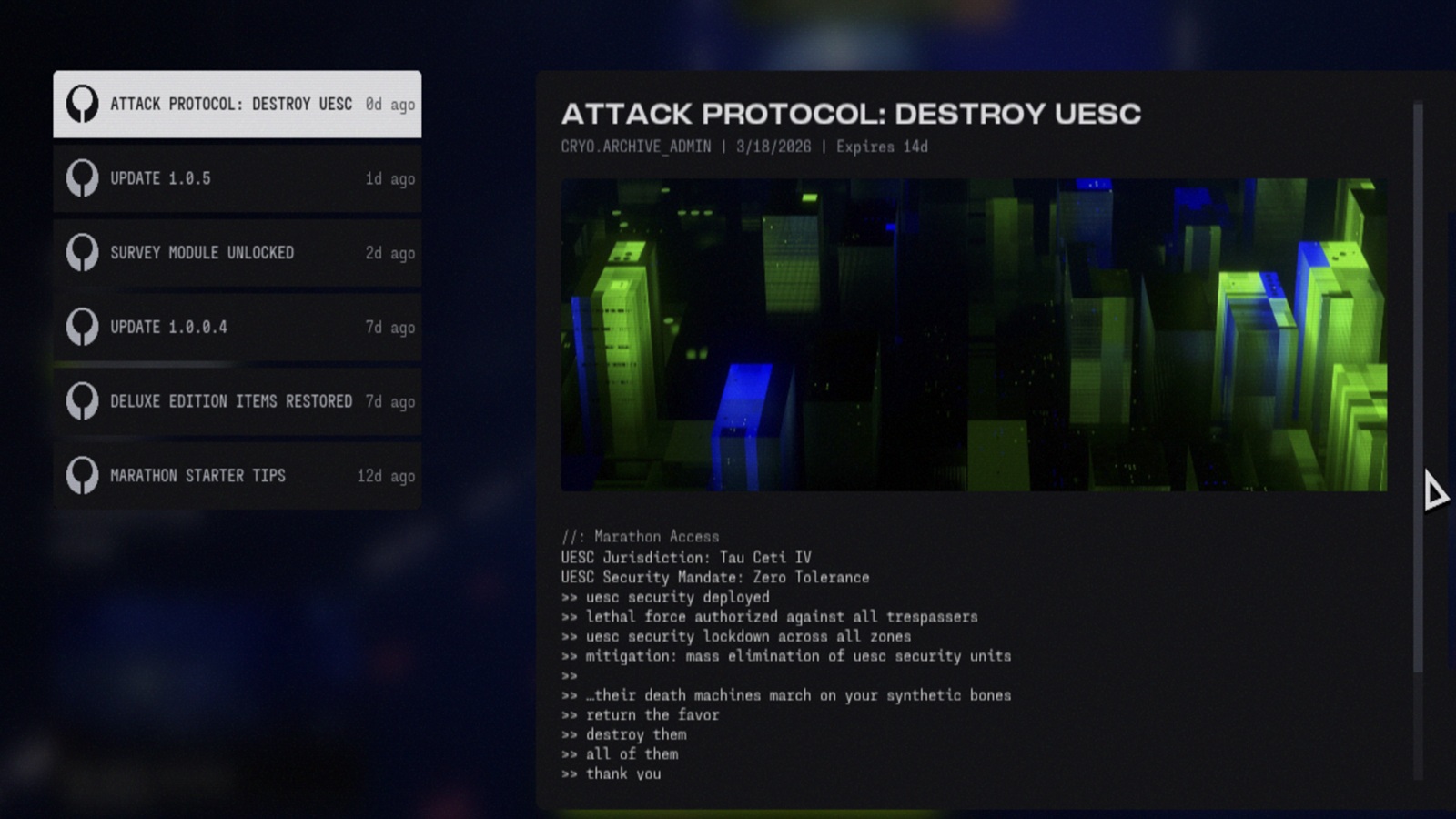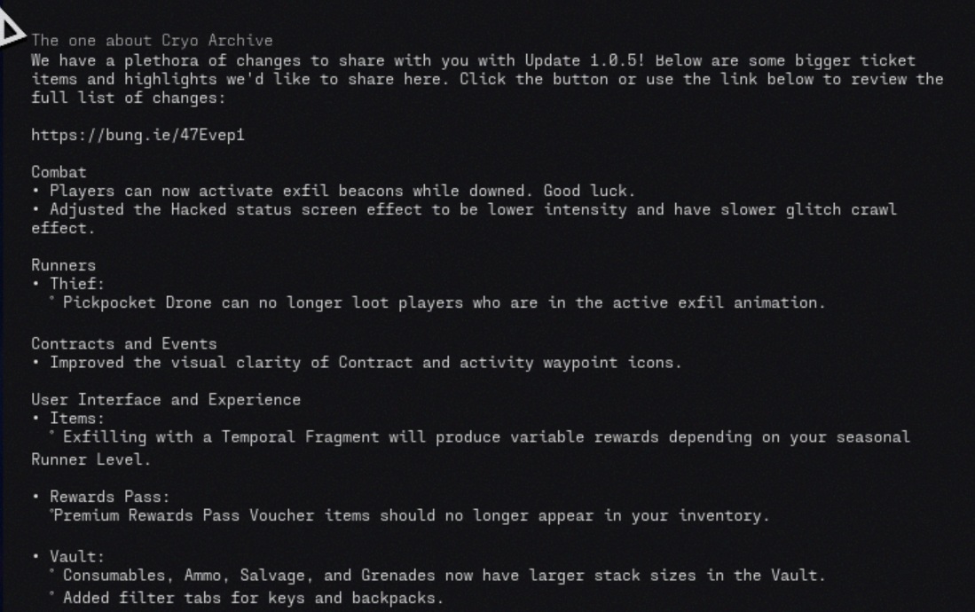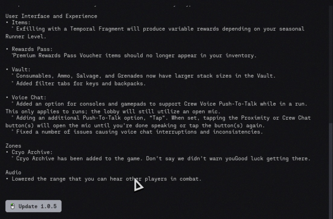 A Marathon 1.0.5-ös frissítése hozzáadja az új Cryo Archive zónát, lehetővé teszi a játékosok számára, hogy aktiválják az exfil jelzőfényeket, miközben lezuhannak, és egy hosszú listát ad ki a változásokról a harc, a szerződések, a felhasználói felület, a voice chat, a stabilitás, a fegyverek, a modok és az audio területén. A Bungie több új zsákmánykiegészítést is kötött közvetlenül a Cryo Archive-hoz, beleértve a csak ott fellelhető implantátum perkeket és modokat.