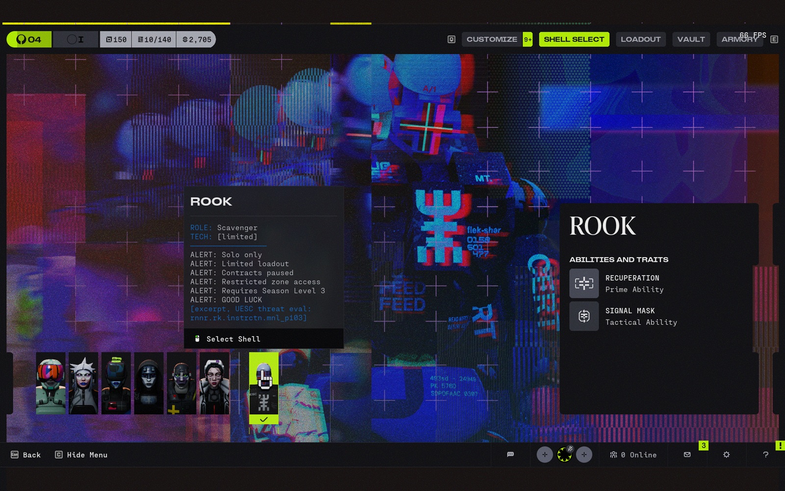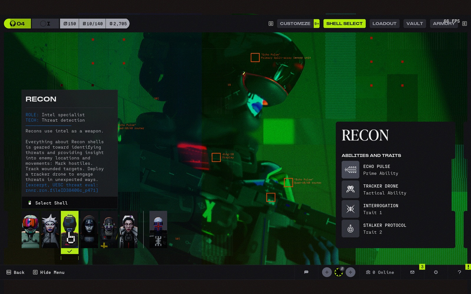 Ez a vizuális identitás a meccseken kívül is átjön. A futás előtti héj képernyők karcsúnak, páncélozottnak, szintetikusnak és kissé személytelennek tűnnek, inkább a funkcióra gyártott speciális testek, mint az önkifejezésre épített hős karakterek. A sötét borítás, a kemény sziluettek, a homlokvédőkkel teli dizájn és a neonkeretes menük ugyanazt a gondolatot erősítik: ezek eszközök, amelyeket egy ellenséges rendszerben vetnek be. Ez sokkal jobban illik a Marathonvilágához, mint egy hagyományosabb hős-lövöldözős megjelenítés tette volna.