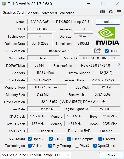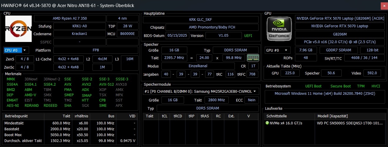 | Acer Nitro 18 AI AN18-61-R10V AMD Ryzen AI 7 350 ⎘ NVIDIA GeForce RTX 5070 Laptop ⎘ 16 GB Memória, 1000 GB SSD | Amazon: List Price: 1900 EUR | 3 kg | 25 mm | 18.00" 2560x1600 168 PPI IPS | |