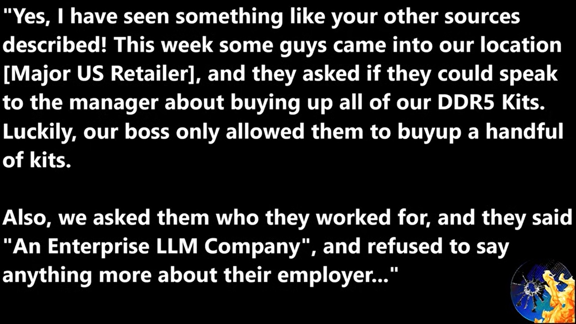 A szerint a Moore's Law Is Dead (Moore törvénye halott)szerint az OpenAI nemcsak a globális memóriakészlet nagy részét halmozza fel, hanem a vállalat állítólag a fogyasztói DDR5 készleteket is felvásárolja. Az OpenAI alkalmazottai állítólag besétálnak a kiskereskedelmi üzletekbe, és megpróbálnak minél több DDR5 készletet megszerezni. Az információ több forrásból, többek között kiskereskedelmi és RAM-beszállítókon keresztül jutott el az MLID-hez.