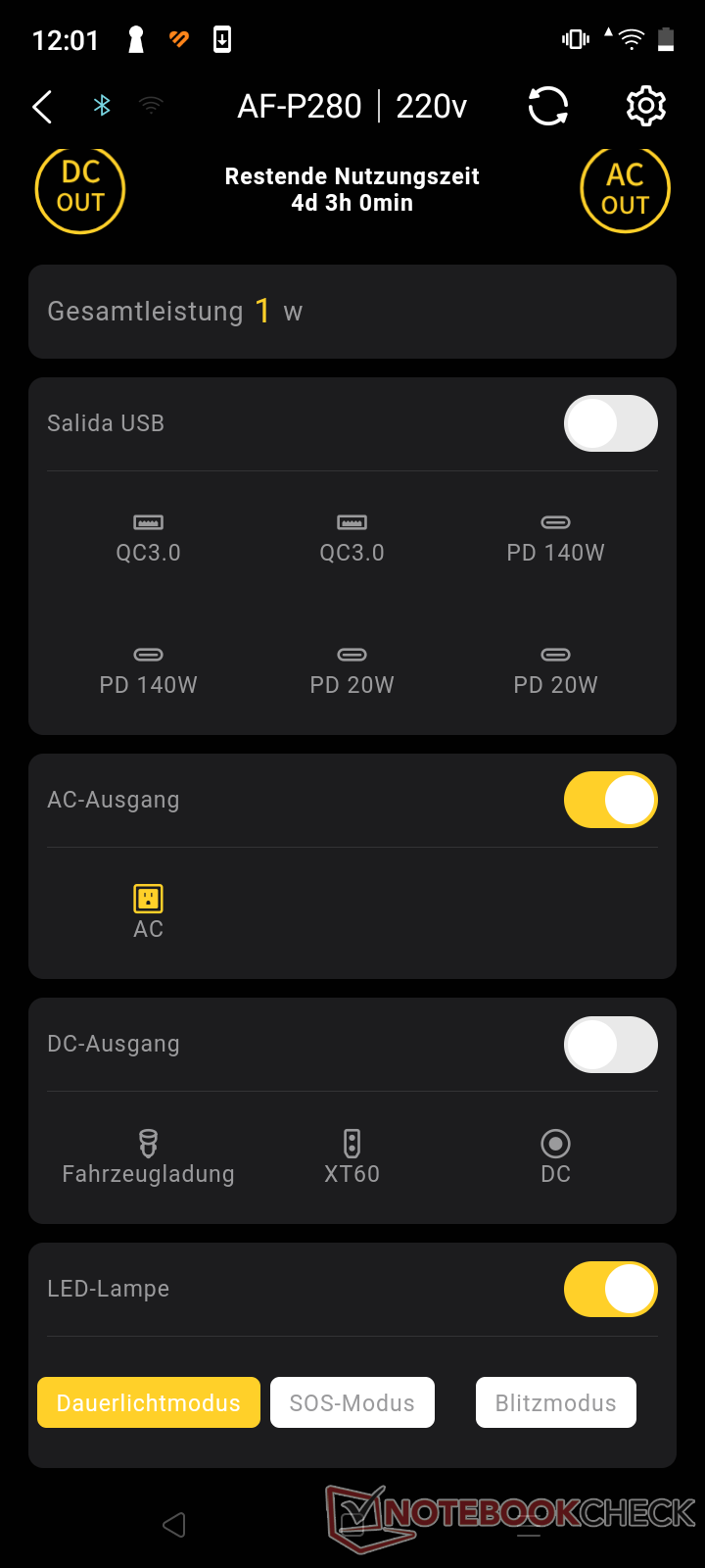 Az Aferiy P280 összesen 13 kimenettel rendelkezik. A különböző egyenáramú csatlakozók (lásd a fenti adatlapot), például egy 12 V-os autós aljzat (max. 120 W) mellett a nagyvonalúan méretezett USB-csatlakozók is érdekesek lehetnek a felhasználók számára. Két USB-C porton keresztül akár 140 W is elérhető. Két további, maximum 20 W-os USB-C port és két 12 W-os USB-A port is rendelkezésre áll.