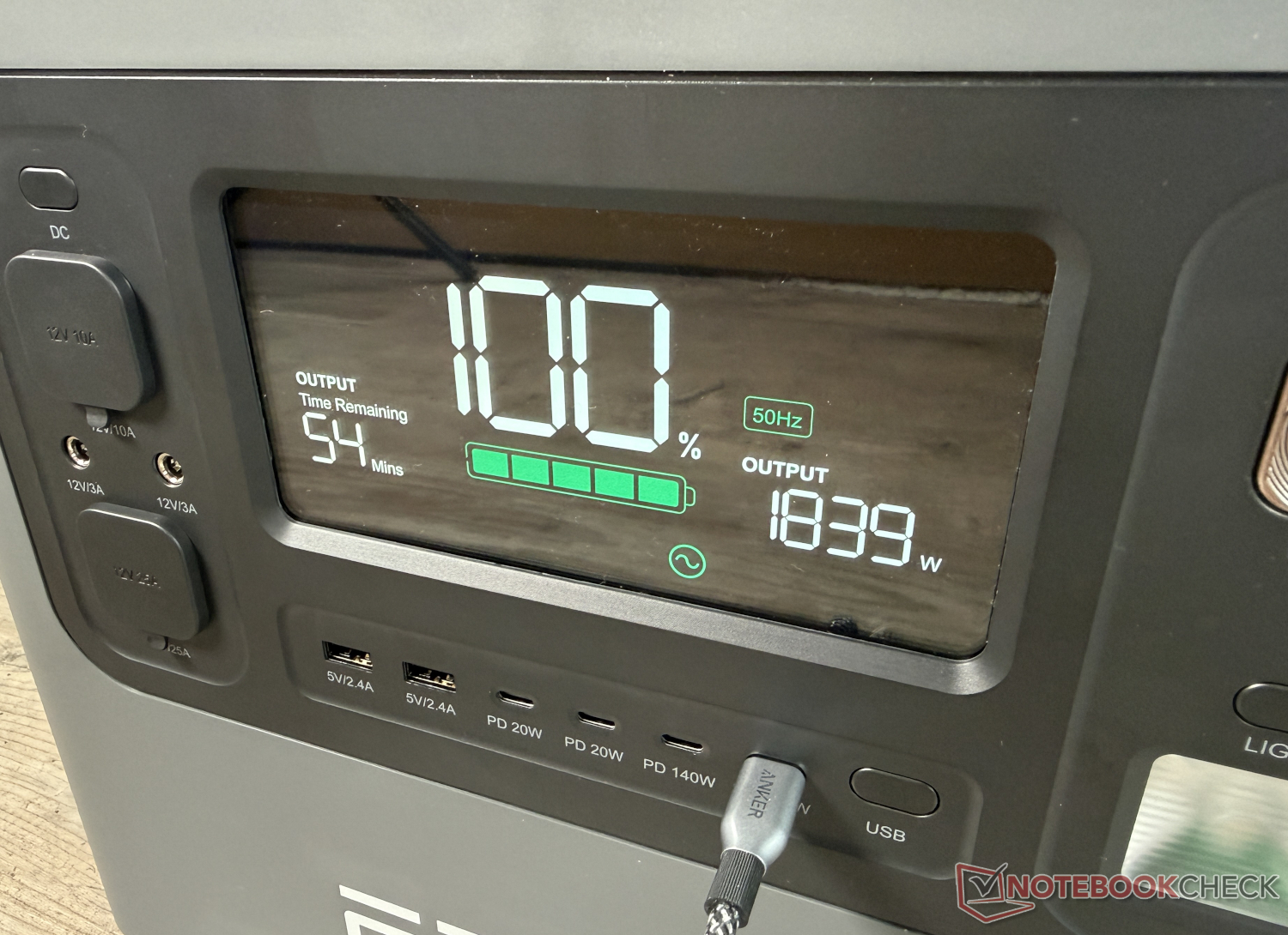 A váltakozó áramú töltés során a Powerstation az ígért 1800 W-ot már az elején elérte, és jó 60 százalékos töltöttségi szintig. Körülbelül 65 perc elteltével 80 százalékos töltöttséget ért el, és további 50 perc elteltével a töltési folyamat befejeződött. A napelemes töltési folyamatot csak korlátozottan lehetett tesztelni, mivel a jelenlegi hamburgi télben kevés a napsütés. Az egyenáramú töltés és kisütés (egyenáram) esetén a hatásfok általában nagyobb, mivel nincsenek átváltási veszteségek a váltakozó áramra.