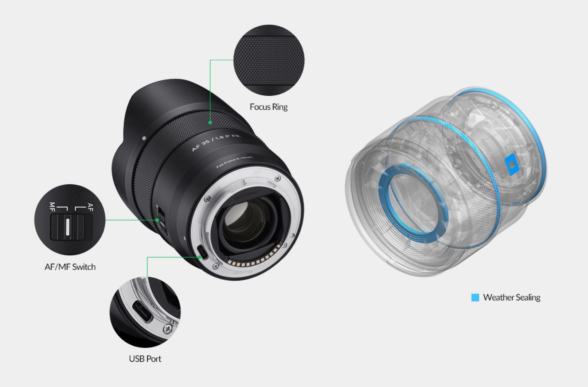 Egy külön csúszkával válthat az autofókusz és a manuális fókusz között. Az objektív 0,27 méteres minimális fókusztávolságot és 62 milliméter átmérőjű szűrőmenetet kínál. Mivel a Samyang nem tudja közvetlenül a fényképezőgépen keresztül telepíteni a firmware-frissítéseket, a gyártó egy USB-C portot épített be a foglalatba, amely a frissítések telepítéséhez használható.
