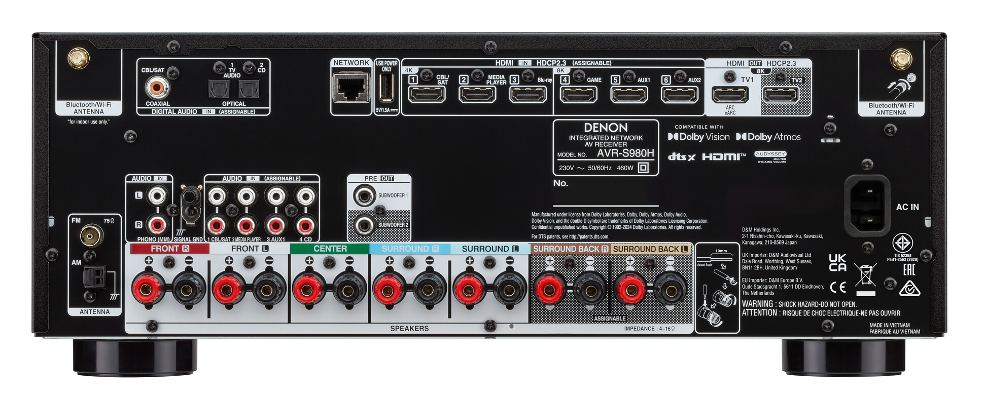 Az Audyssey MultEQ szobaakusztikai korrekciós rendszer kalibrálja a hangszórókat, és automatikusan beállítja a hangszórók szintjét és távolságát az adott körülményekhez és a hallgatási területhez. A Dolby Atmos mellett a Denon AVR-S980H támogatja többek között a 4K és 8K videókat, a játékokat 1440p pass-through és AMD FreeSync funkcióval, valamint a DTS:X, a Dolby Vision és a HDR10+ technológiákat. Az audio streaminghez Bluetooth, AirPlay 2, Spotify Connect és HEOS Multiroom Audio áll rendelkezésre.
