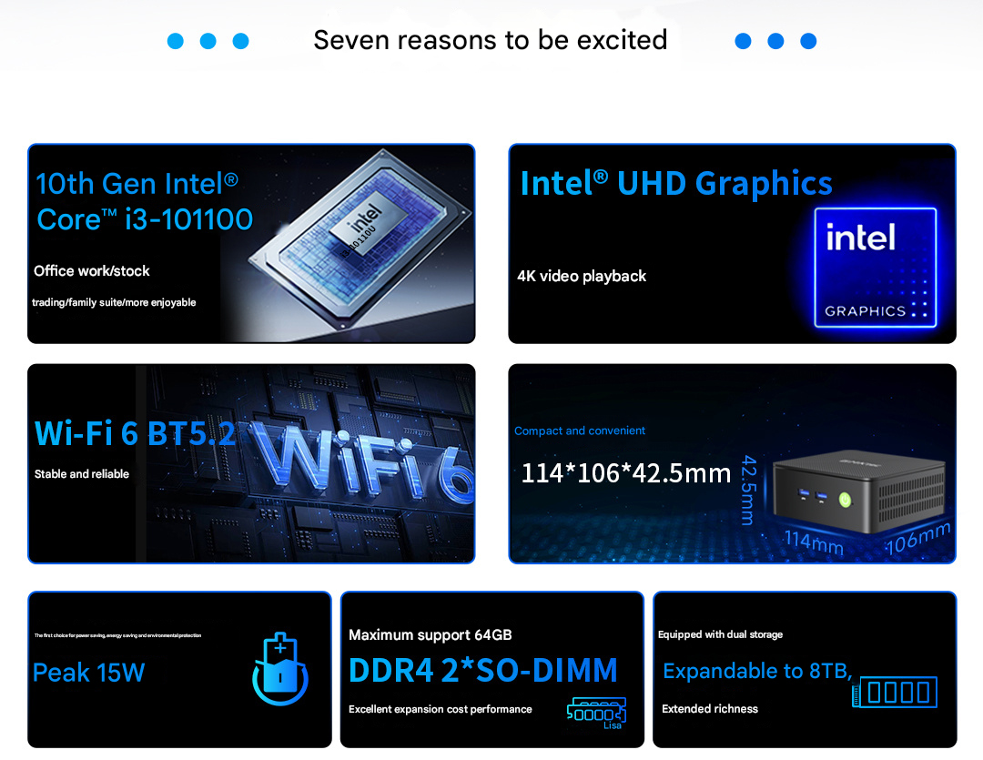 A termék a következő jellemzőkkel rendelkezik Core i3 10110U, egy megfizethető mobil processzor a Comet Lake termékcsaládból. A CPU két magot és négy szálat tartalmaz, ami azt jelenti, hogy a mini PC nem lesz képes a nehéz munkaterheléseket könnyedén kezelni. Ott van az Intel UHD 620 iGPU, amely ugrásszerűen elmarad a legújabb integrált GPU-s megoldásoktól, de a szokásos médiát még így is jól kezeli.