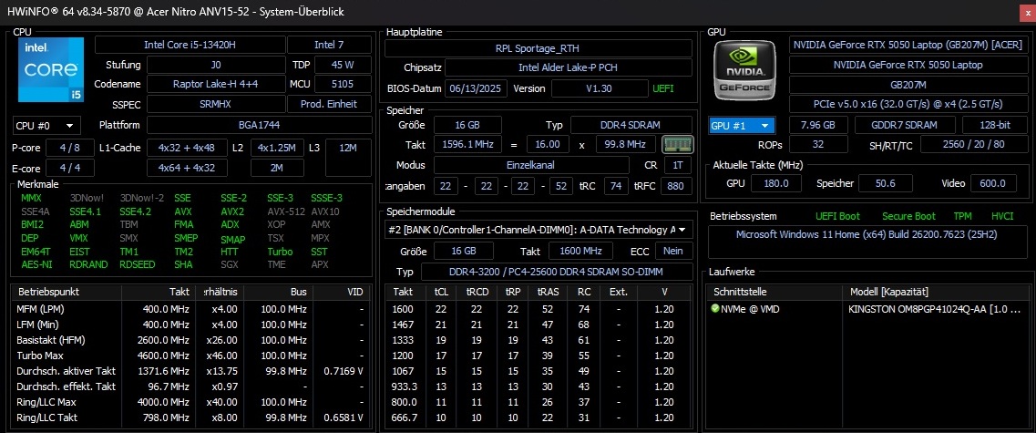 | Acer Nitro V 15 ANV15-52-50S2 Intel Core i5-13420H ⎘ NVIDIA GeForce RTX 5050 Laptop ⎘ 16 GB Memória, 1024 GB SSD | List Price: 1049 EUR | 2.1 kg | 23.5 mm | 15.60" 1920x1080 141 PPI IPS | |