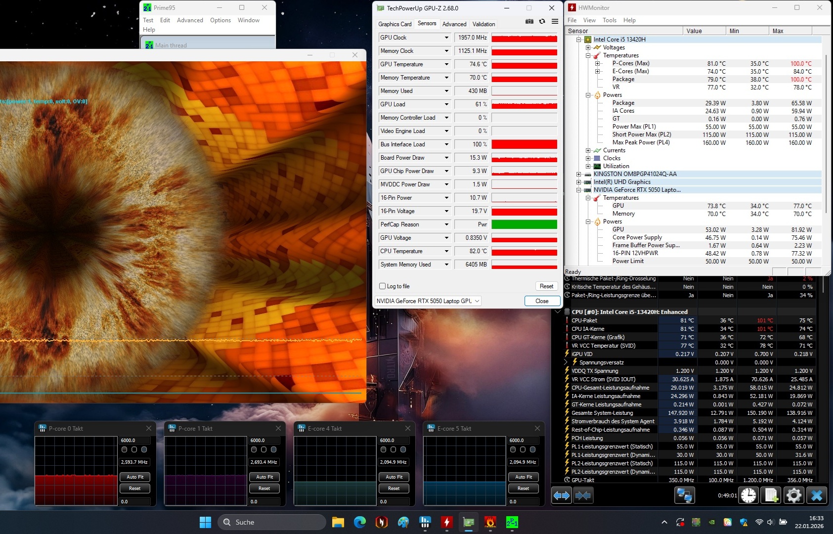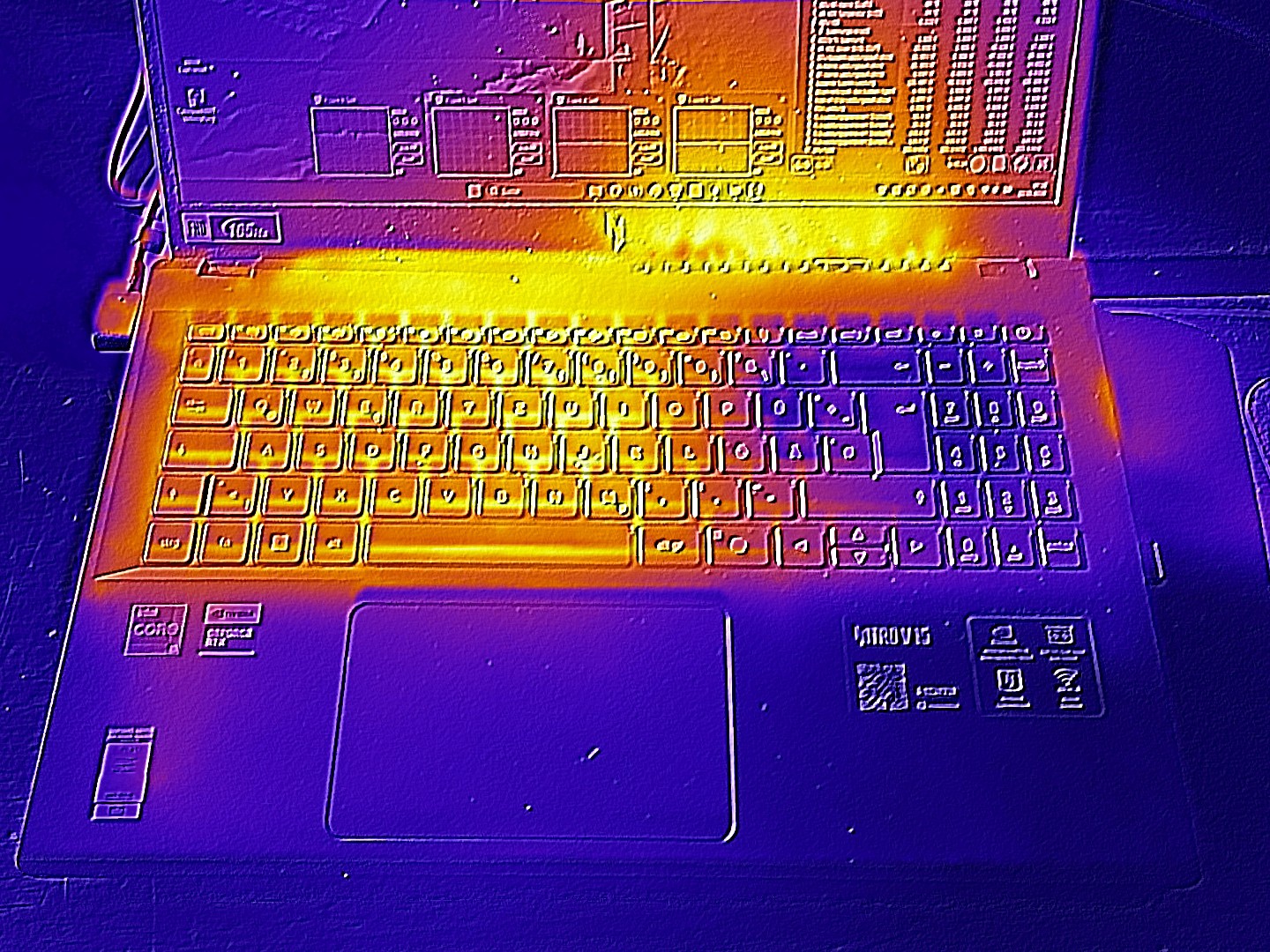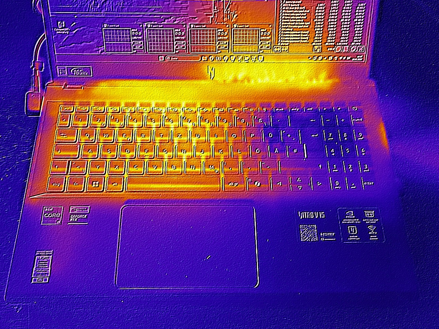 A hőmérsékletek megfelelnek az RTX 5050-es laptopok elvárásainak. Üresjáratban a ház kellemesen hűvös marad.