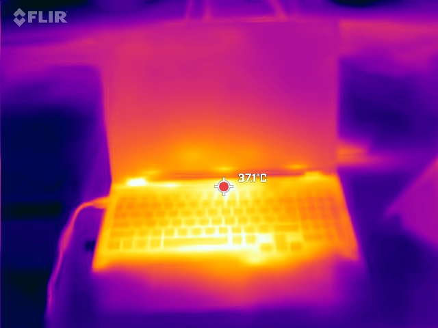 Terhelés alatt ez a modell hűvösebb fut, mint a Ti változat. A hátsó alsó részen 44 °C-os forróságot mértünk (szemben a Ti 50 °C-os értékével). A WASD billentyűk 37 °C-on maradnak, és a tenyértámaszok is kényelmesek maradnak.