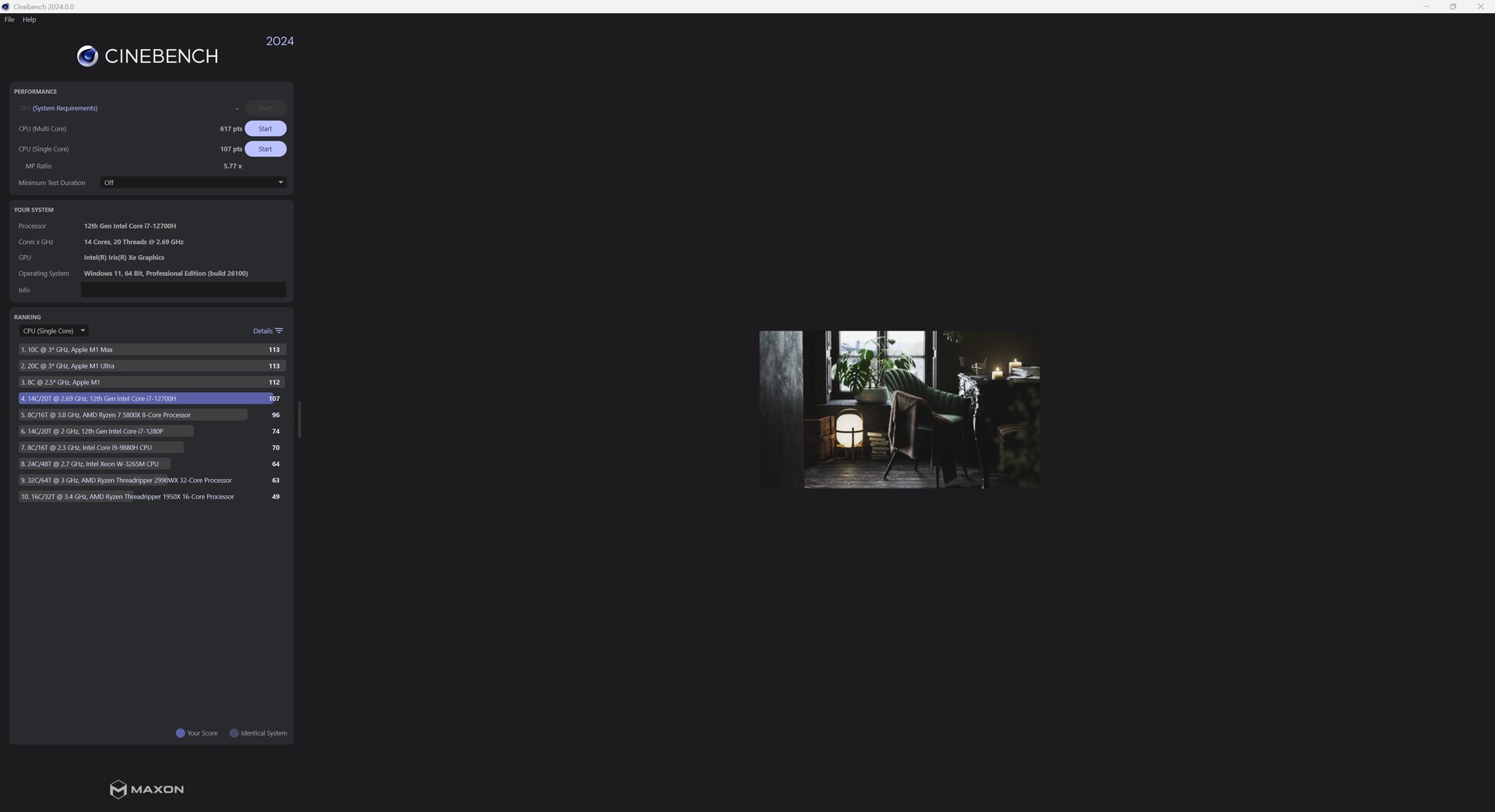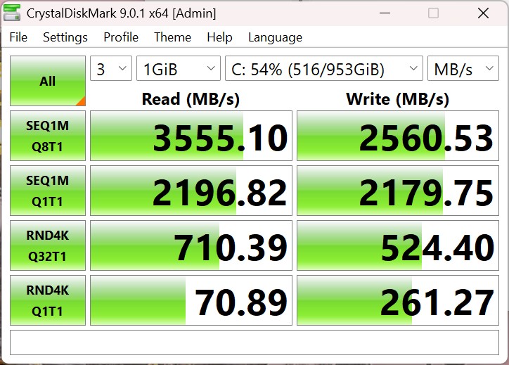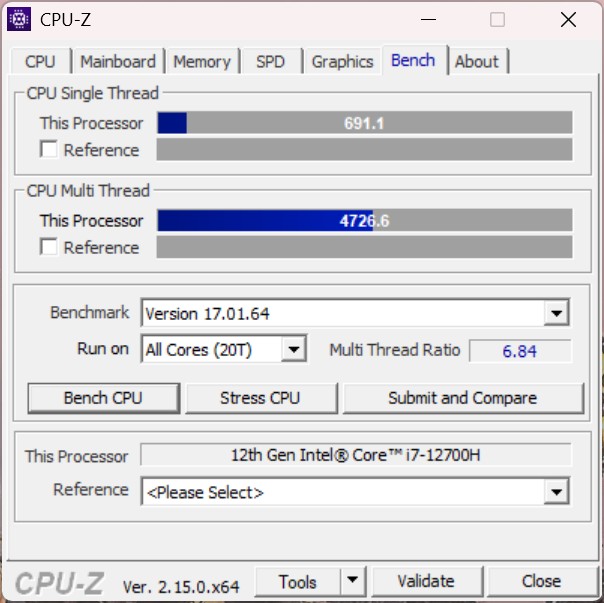 A Intel Core i7-12700H 14 magjával (6P + 8E) szilárd teljesítményt nyújt. Ami az energiafogyasztást illeti, a SoC mindössze 35 wattal dolgozik, ami az Intel specifikációi szerint a garantált minimális teljesítmény. Ez azt jelenti, hogy a processzor a többszálas feladatokban nem tud lépést tartani a versenytársakkal.