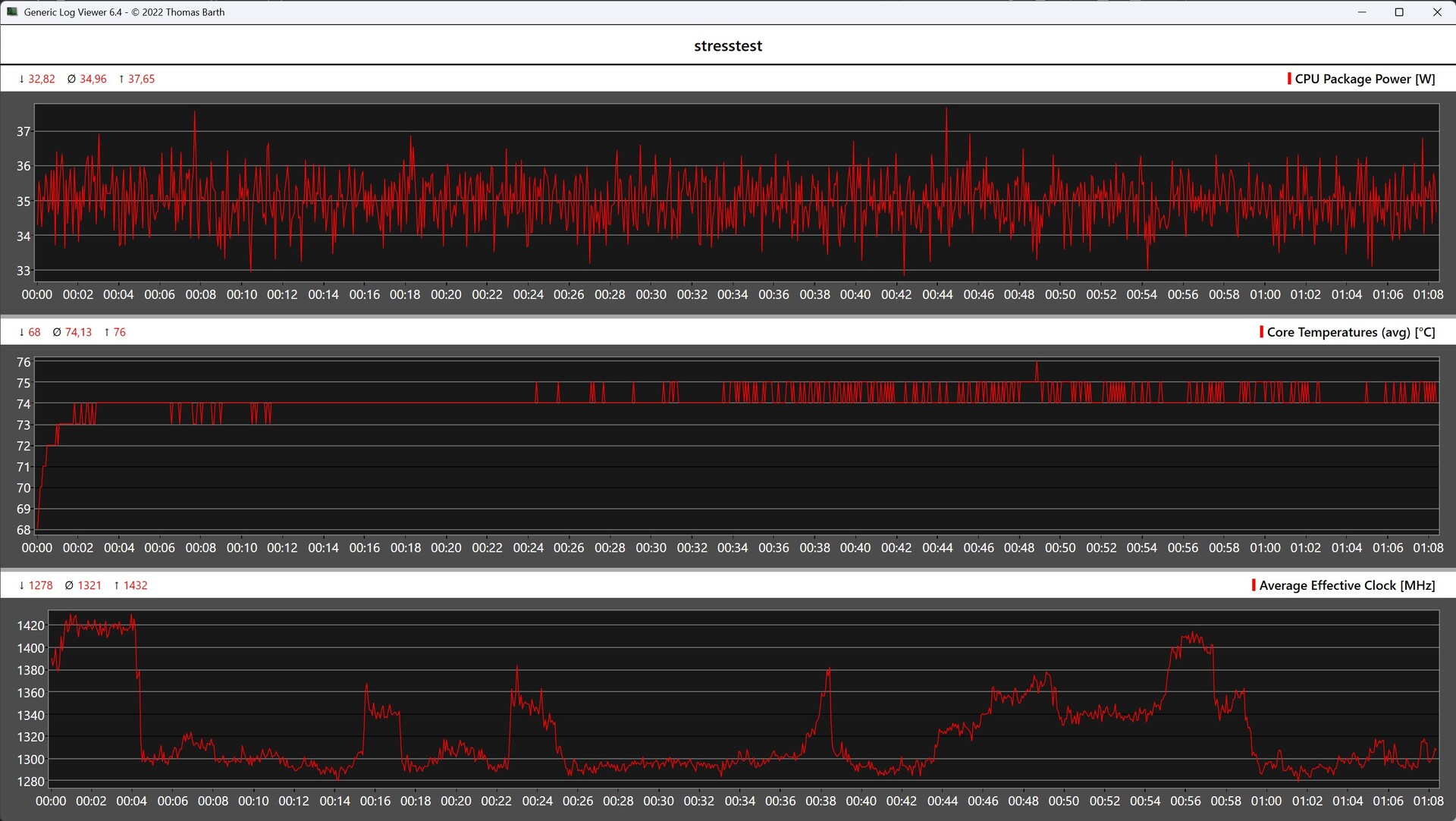 Terhelés alatt a GMKtec NucBox M3 Ultra burkolata érezhetően felmelegszik, és az alján közel 50 C-os csúcsértéket ér el. A stresszteszt során az Intel Core i7-12700H kezdetben 76 C körüli hőmérsékletre emelkedik, majd 74 C körül stabilizálódik. A SoC energiafogyasztása enyhén ingadozik 33 és 37 watt között, bár átlagosan 35 wattot ér el.