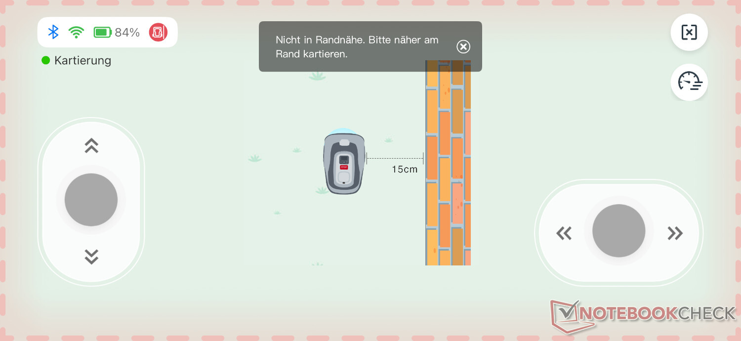 Alternatív megoldásként a kézi hozzárendelés is lehetséges. Ebben az esetben a robotfűnyírót egy bevezető körre az okostelefon kijelzőjén lévő két virtuális joystick segítségével kell irányítani. Ez elvileg jól működik, mivel az irányítás kellemes és nem túl érzékeny. Így a robotfűnyíró pontosan a gyep határai mentén irányítható.
