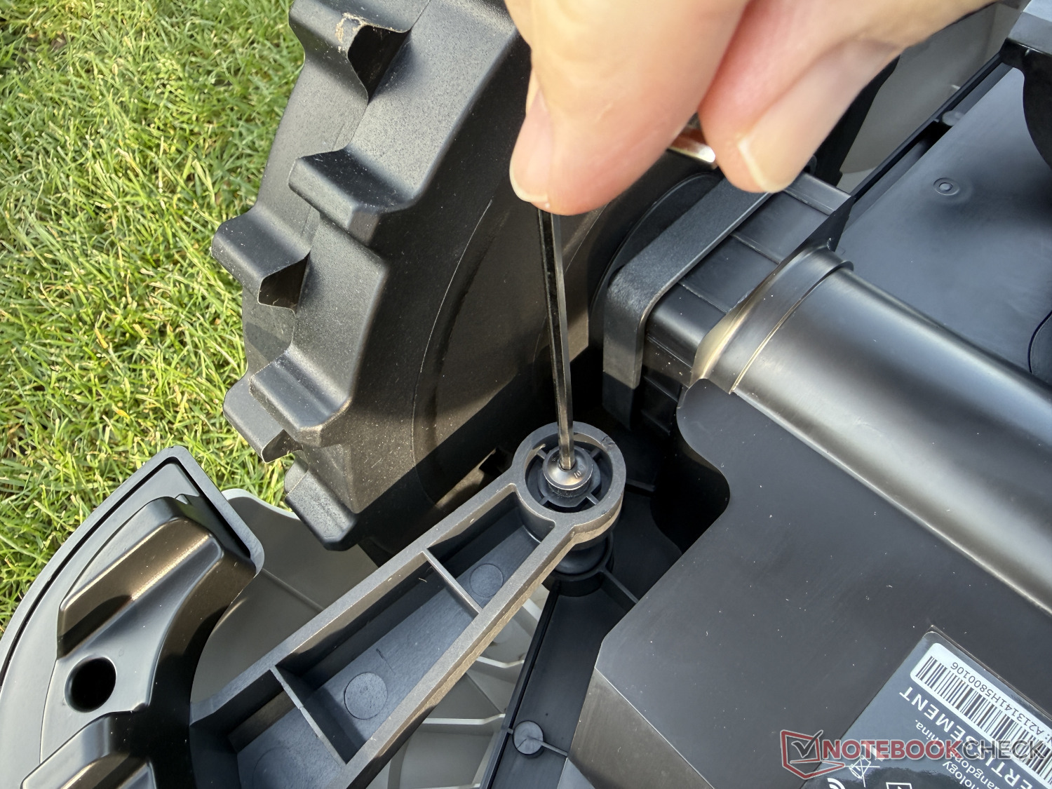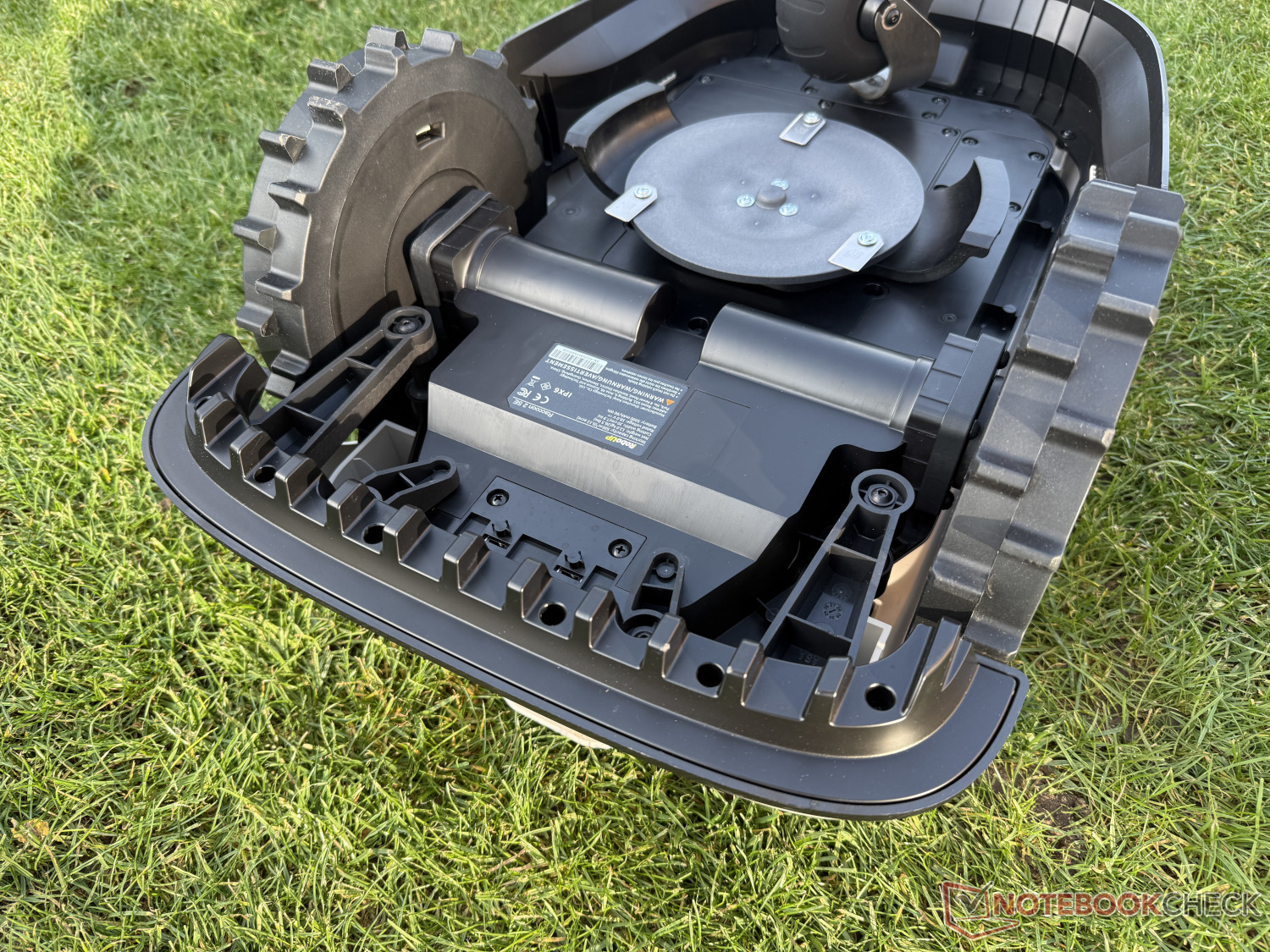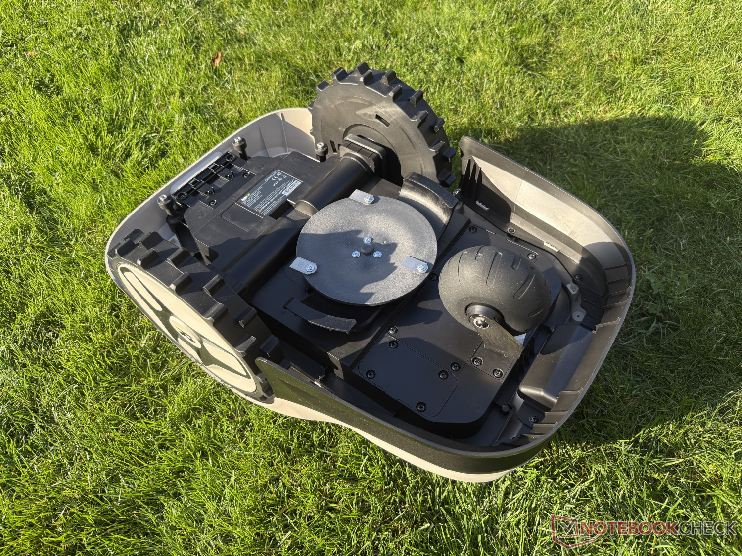 Az alján az elülső két nagy hajtókerék és a hátsó harmadik kerék mellett a fűnyírófedélzet található. A forgó kaszakorong három szabadon lengő késsel van felszerelve, és 20 cm-es vágási szélességgel rendelkezik. Ez nem nagy, de egy kiskertekbe tervezett modell esetében elegendő.