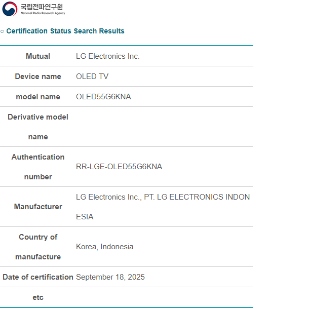 A közelmúltban a DisplaySpecifications leleplezte az LG C6 és G6 tévéket a Nemzeti Rádiókutatási Ügynökség (NRRA) adatbázisában dél-Koreában. Itt mindkettő 55 hüvelykes méretben szerepel, mint az adott piacon történő értékesítésre hitelesített. Ezeket a modelleket várhatóan többféle méretben kínálják majd. Összehasonlításképpen: a 2025 C5 42, 48, 55, 65, 77 és 83 colos változatban kapható, míg a G5 55, 65, 77, 83 vagy 97 colos tévéként vásárolható meg.