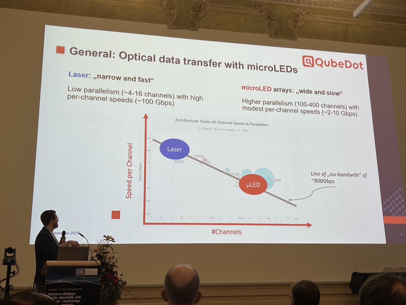 Az adatkommunikáció területén ezek a kis LED-ek szintén egészen egyedülállóak. Bár nem rendelkeznek a klasszikus lézerek sávszélességével, mint például a kapcsolók GBIC moduljaiban az SFP-helyeken találhatóak, de könnyebben párhuzamosíthatók. A Qubedot szerint csatornánként két-tíz Gbit/s érhető el. A lényeg itt az, hogy a potenciál állítólag 100 és 400 csatorna között van. A legjobb esetben ez azt jelenti, hogy 500 GB/s lehetséges. Összehasonlításképpen: a klasszikus lézeres kommunikáció általában 100 Gbit/s sebességet biztosít, és négy és 16 párhuzamos csatornát tesz lehetővé.