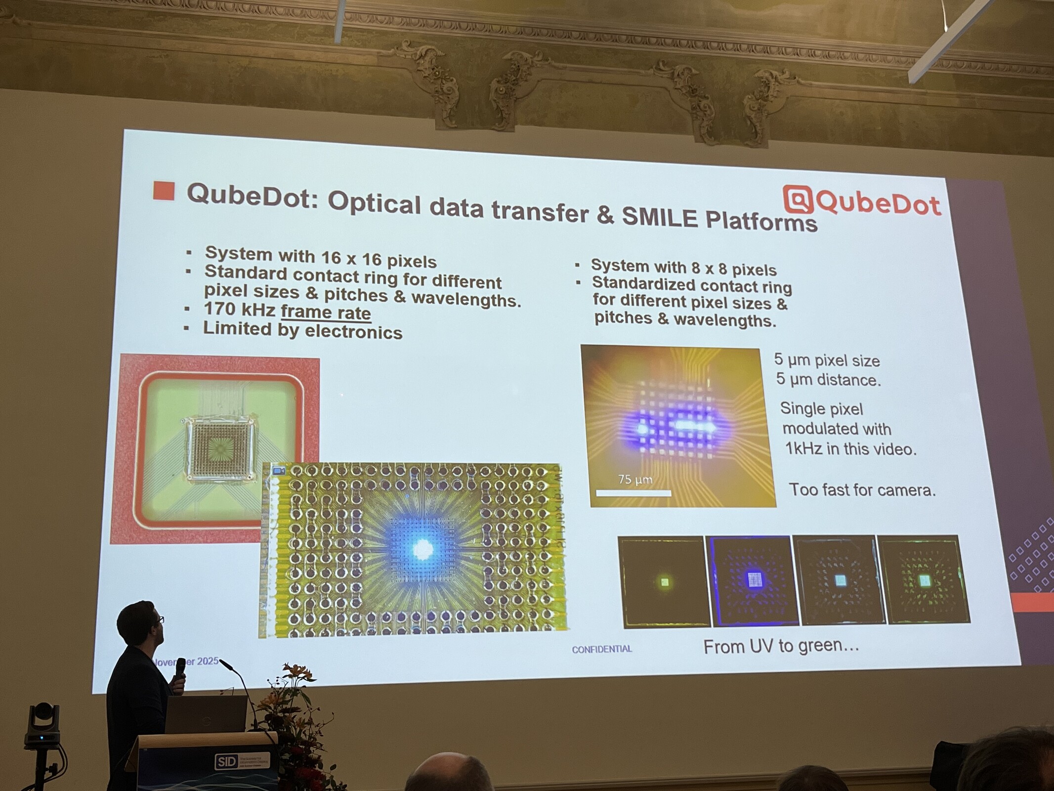 E csoportok közül kettő a SID-MEC konferencián mutatta be munkáját. A potenciál jelentős, amint azt a francia Aledia és a német Qubedot cég előadásai is mutatták. Mindkét vállalat elsősorban a microLED kijelzőkkel foglalkozik, a Qubedot pedig az egyedi pixelekre specializálódott, amelyek akár betűkhöz is hasonlíthatnak.