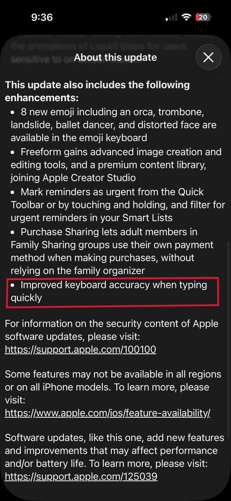 Egy Apple támogató felhasználó 2025 novemberében jelentette a hogy a képernyőn történő gépelés pontossága "drámaian csökkent" a frissítés után. 2026 elejére a panaszok elég gyakoriak voltak az interneten. A MacRumors leírta "többszörös panaszt" arról, hogy az iOS 26 miatt a billentyűzetek "sokkal hibatűrőbbé" váltak. Egy Reddit-fonalban egy felhasználó arról panaszkodott, hogy a billentyűzetük "elmaradozott, hiányzott a bevitel, [és] az automatikus korrekció hülyeségeket írt", ami a telefont szinte "használhatatlanná" tette számára. Néhány felhasználó az iOS-re vezette vissza a problémát - nem hardverprobléma vagy egy adott alkalmazás volt, és nem a lassabb gépeléssel történt. Egyszóval, aki elég gyorsan gépelt, az belefutott. És ekkor már nem csak egy szélestényezőről volt szó, sokkal inkább egy széles körben elterjedt problémáról.
