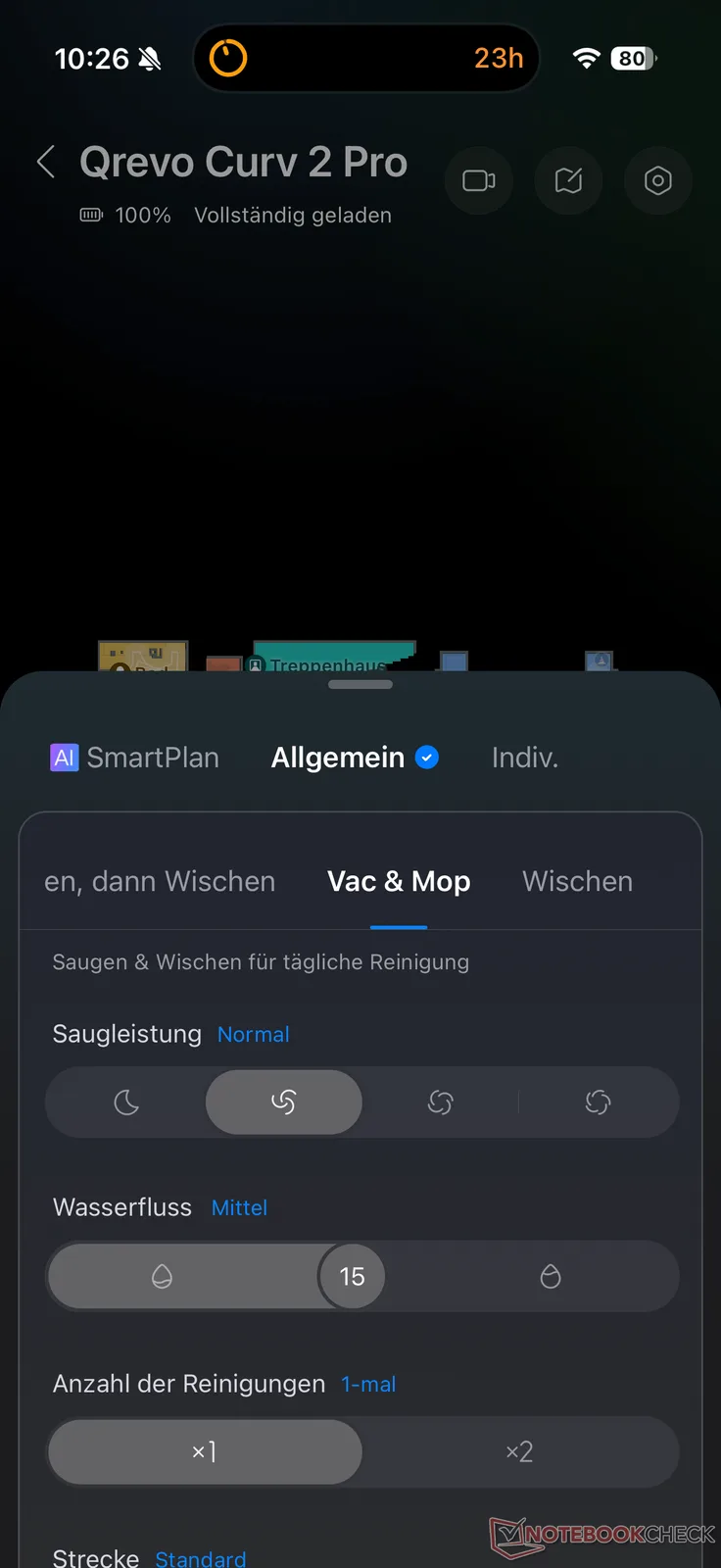 Ugyanez vonatkozik a tisztítási beállításokra is. Választásától függően a robot először porszívózik, majd felmos, egyszerre végzi mindkettőt, vagy csak porszívózik, illetve felmos. A szívóteljesítmény négy fokozatban állítható, a vízáramlás pedig akár 30 órában is beállítható. További opciók is rendelkezésre állnak, mint például a takarítási menetszám és az útvonalválasztás alapossága.