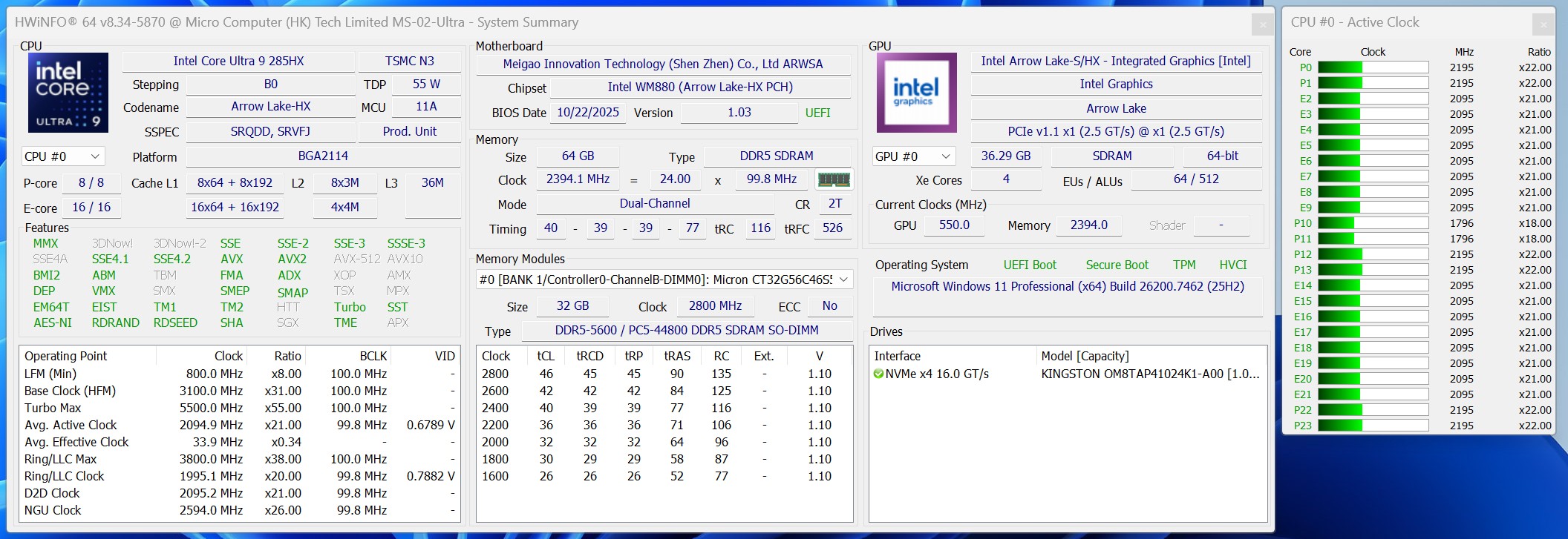 A Minisforum MS-02 Ultra jelenleg az egyik legerősebb Intel CPU-val rendelkező Mini-PC. A Intel Core Ultra 9 285HX A Minisforum az egyik legerősebb processzort telepíti, amelyet az Intel jelenleg a portfóliójában tart. Kompakt munkaállomásként az MS-02 Ultra akár 256 GB RAM-mal és több SSD-vel is felszerelhető. Még dedikált grafikus kártyák is telepíthetők, bár a rendelkezésre álló hely néhány modellre korlátozza a választást. Olcsóbb alternatívaként az MS-02 Ultra felszerelhető egy Intel Core Ultra 9 275HX is rendelhető.