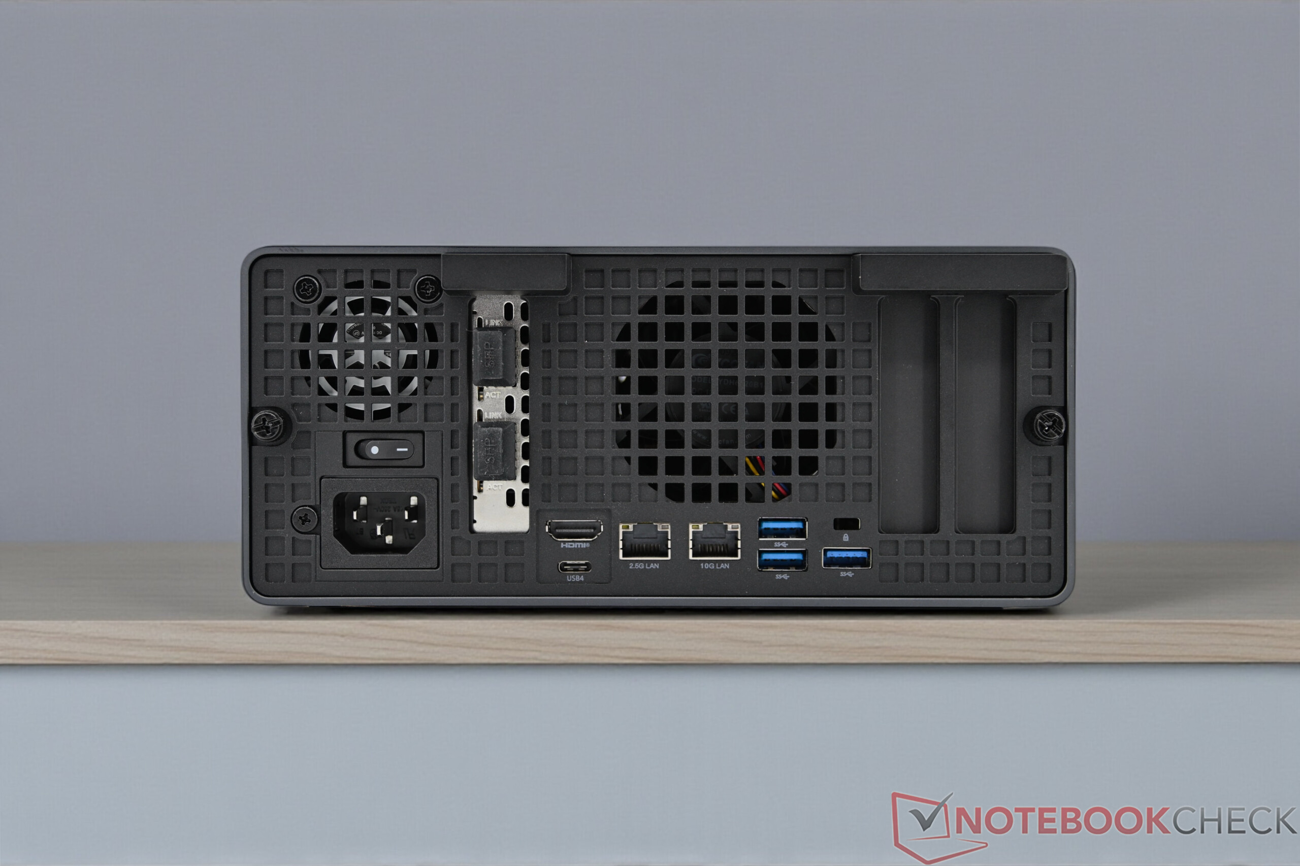 A Minisforum MS-02 Ultra kiváló minőségű házzal nyűgöz le, amely harmonikusan ötvözi a fémet és a műanyagot, és professzionális benyomást kelt. A mini PC a csatlakozók tekintetében is rendkívül nagyvonalúan felszerelt: több modern, nagy sebességű port, köztük USB4 V2 biztosítja a maximális rugalmasságot a perifériák és külső bővítmények számára. A hálózati felszereltség különösen figyelemre méltó: a 2,5 Gigabites és 10 Gigabites LAN mellett a rendszer két SFP+ porttal rendelkezik, amelyek akár 25 GbE átviteli sebességet is lehetővé tesznek. A kompakt rendszer lehetővé teszi egy dedikált grafikus kártya kompakt SFF formátumú telepítését is.