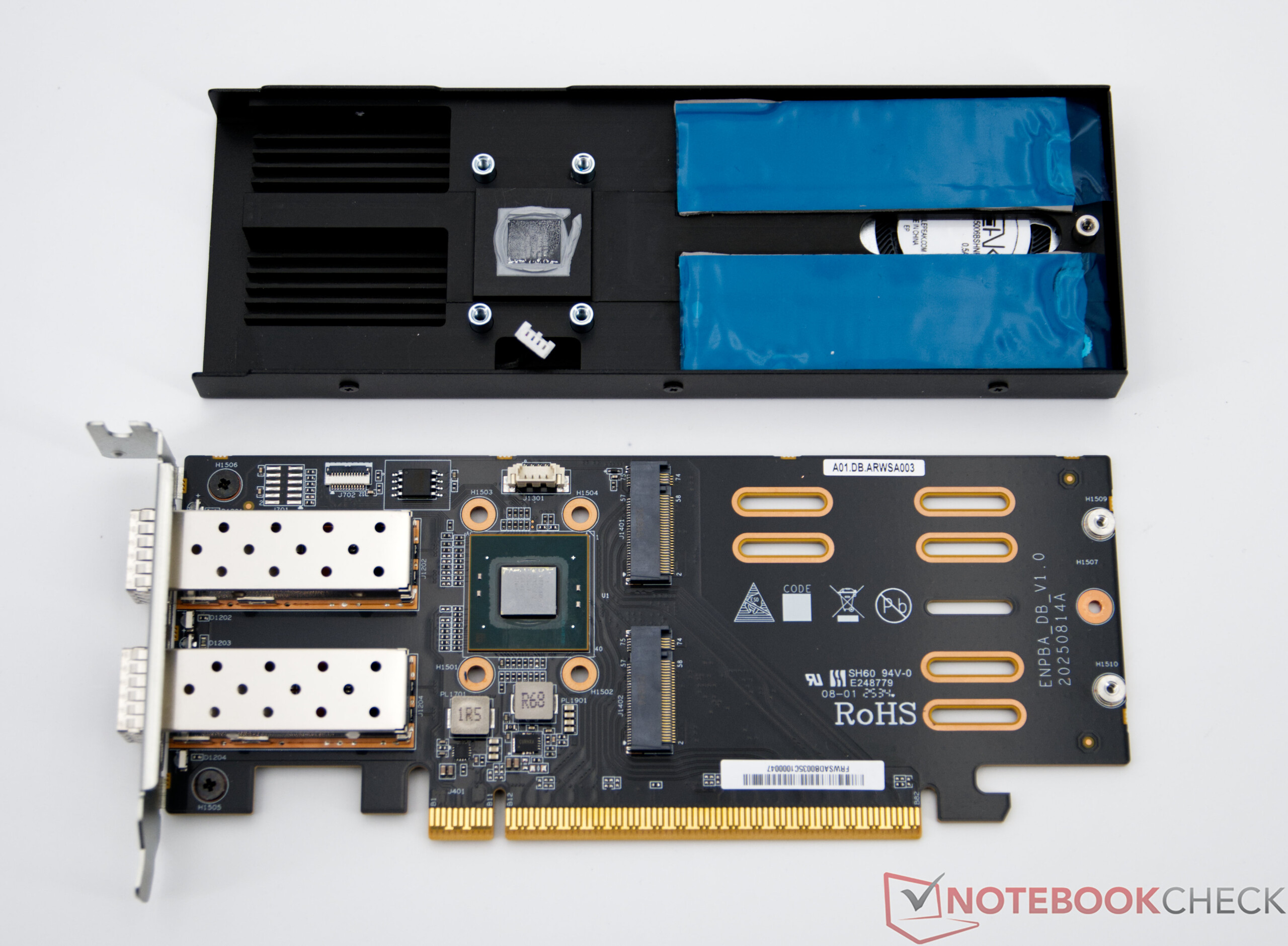 A tartozékok száma kevés, és két kábelt (IEC és HDMI csatlakozókábel), valamint egy másik passzív SSD-hűtőt tartalmaznak, különösen lapos kivitelben. A csúcsmodell PCIe dugókártyával is rendelkezik, amely a két SFP+ porton kívül további két M.2 SSD számára kínál helyet. Ez az adapterkártya nem tartozik a Minisforum MS-02 Ultra Intel Core Ultra 7 275HX CPU-val ellátott modellhez.