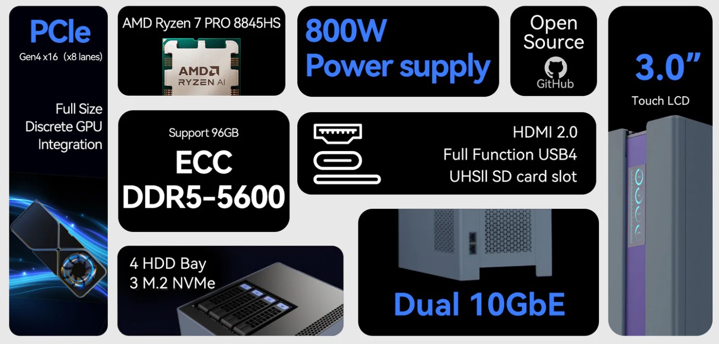 A 218 x 193 x 372 mm-es rendszer négy darab 3,5 hüvelykes merevlemez beépítését támogatja, így hálózati tárolóként is hasznosítható. Ennek érdekében különböző RAID-konfigurációkat támogatnak, és három M.2 2280-as, PCIe 4.0 csatlakozóval rendelkező SSD is található a fedélzeten. A hálózati csatlakoztathatóságot két Ethernet-port biztosítja, egyenként legfeljebb 10 Gbit/s adatátviteli sebességgel.
