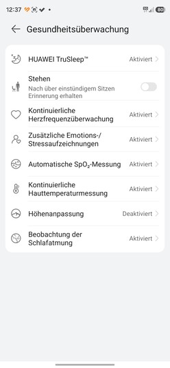 A Huawei okosórája szokás szerint automatikusan nyomon követi az egészségügyi mérőszámok széles skáláját, és lehetővé teszi a kézi nyomon követést is. Ezek közé tartozik a pulzusszám, a pulzushullám-elemzés, a vér oxigéntelítettsége (SpO2), a stresszszint vagy a jóllét, a szívritmus-variabilitás (HRV) és a bőrhőmérséklet. Ez utóbbi a cikluskövetéshez is használható. Kézzel is mérheti az artériás merevséget és készíthet EKG-kat. A TruSleep alváskövetési funkció is visszaköszön.
