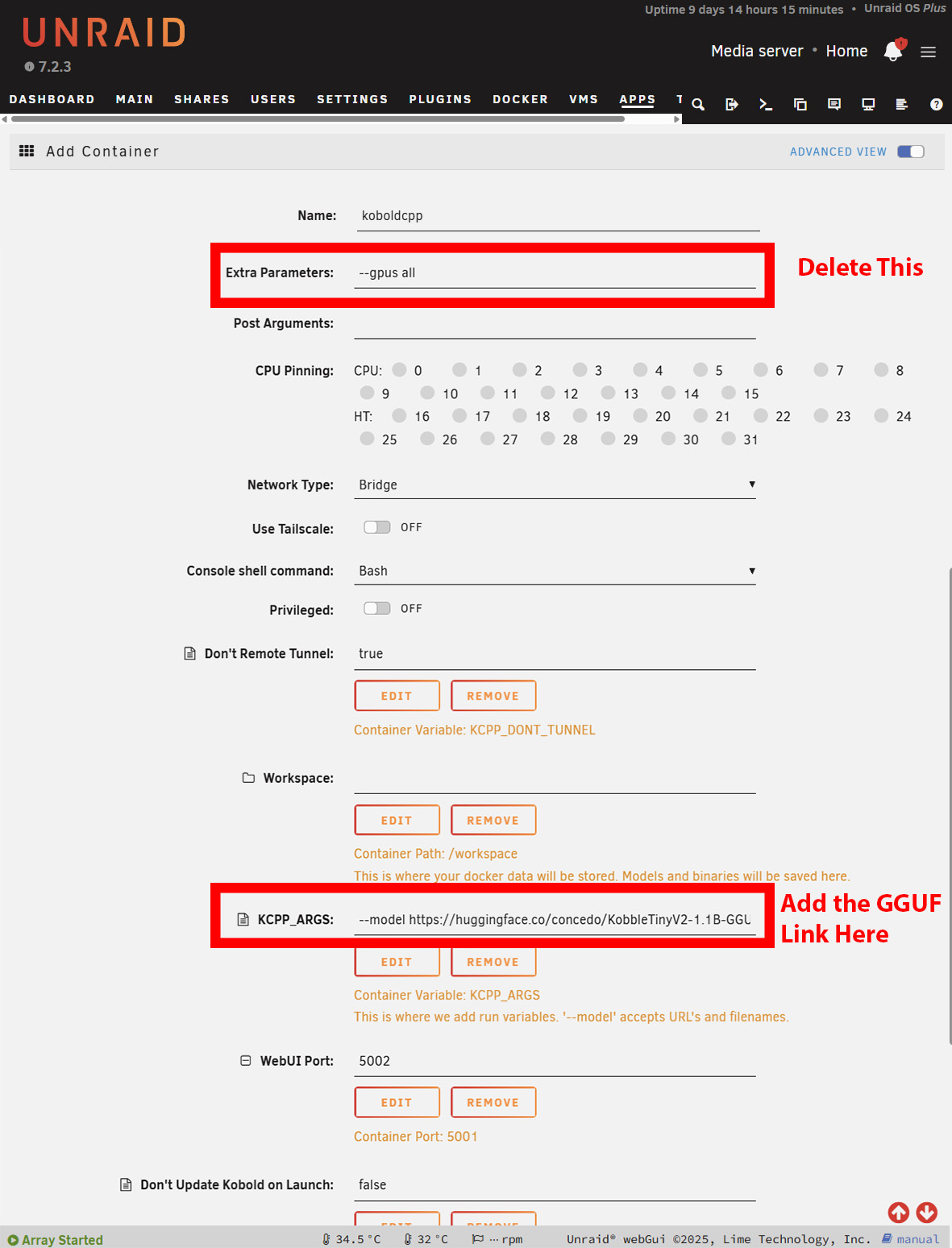 A telepítés Windows alatt nagyjából ugyanez. Azonban le kell töltenie a NoCUDA programot verziót, ha GPU nélkül használja. Az indítás eltarthat egy ideig, mivel a KoboldCPP letölti a modellt, mielőtt megjelenik a kezelőfelület. Windowson ez nyilvánvaló, de Unraid vagy TrueNAS rendszeren meg kell nyitni a naplókat, hogy lássuk a letöltés előrehaladását. Az Unraid rendszeren szükség lehet a növelésére a Docker-konténerek rendelkezésre álló tárhelyét, attól függően, hogy mekkora a választott modell.
