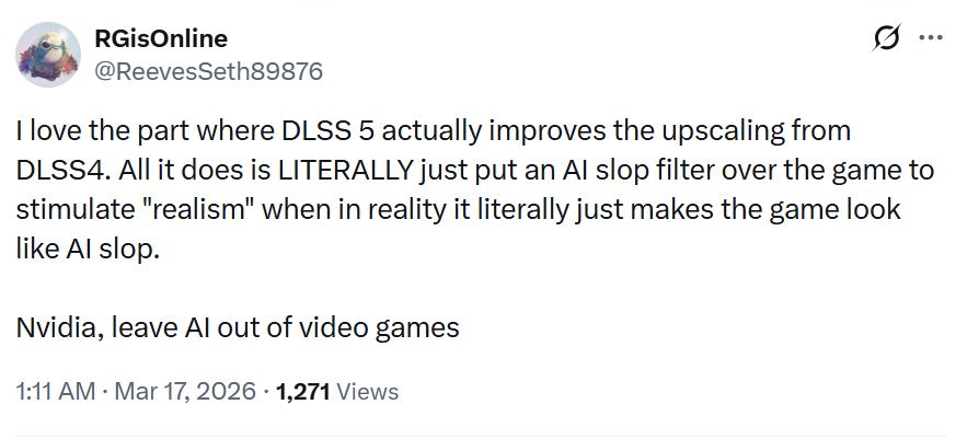 A DLSS 5 körüli online diskurzusok többsége szupernegatív volt, mivel a DLSS 5-re adott első reakciók eléggé zsigeri jellegűek. Néhányan AI mosléknak nevezik, míg mások azon siránkoznak, hogy a DLSS 5 teljesen tönkreteszi a művészi látásmódot. A játékosok Nexus nevezte DLSS 5 Grace átalakítását "egy mesterséges intelligencia által generált társkereső profilképnek, amelyet arra használnak, hogy átverjenek egy idős embert egy másik országban" A GN arra is panaszkodik, hogy "nincs karaktere vagy lelke"