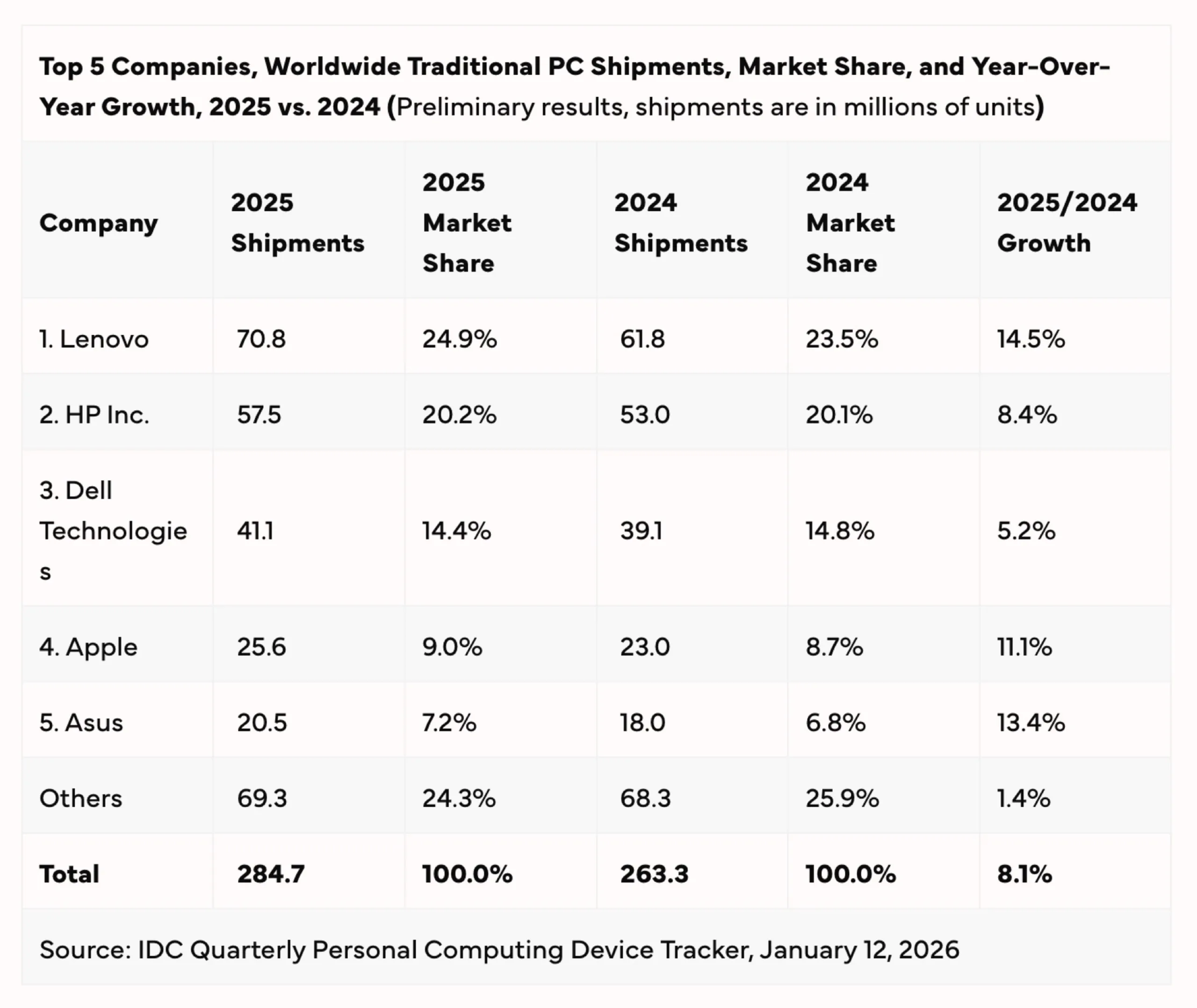 A HP 57,5 millió eladott számítógéppel és 20,2%-os piaci részesedéssel a második helyen áll, őt követi a Dell 41,1 millió eladott készülékkel és 14,4%-os piaci részesedéssel. 25,6 millió eladott Mac-el és 9,0%-os piaci részesedéssel a negyedik helyen áll a Apple. Az ötödik helyen álló Asushoz képest azonban csökkent a különbség, mivel az Asus tavaly 20,5 millió PC-t adott el és 7,2%-os piaci részesedést ért el.