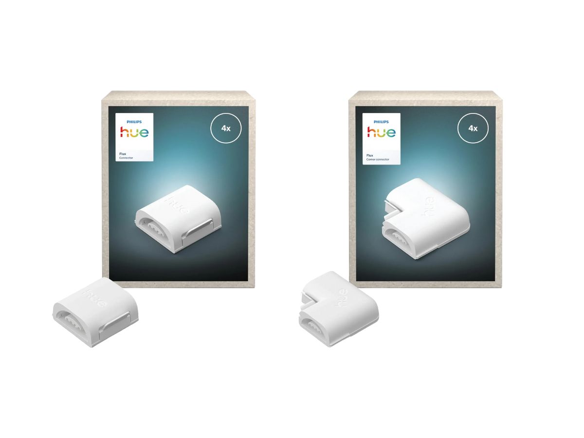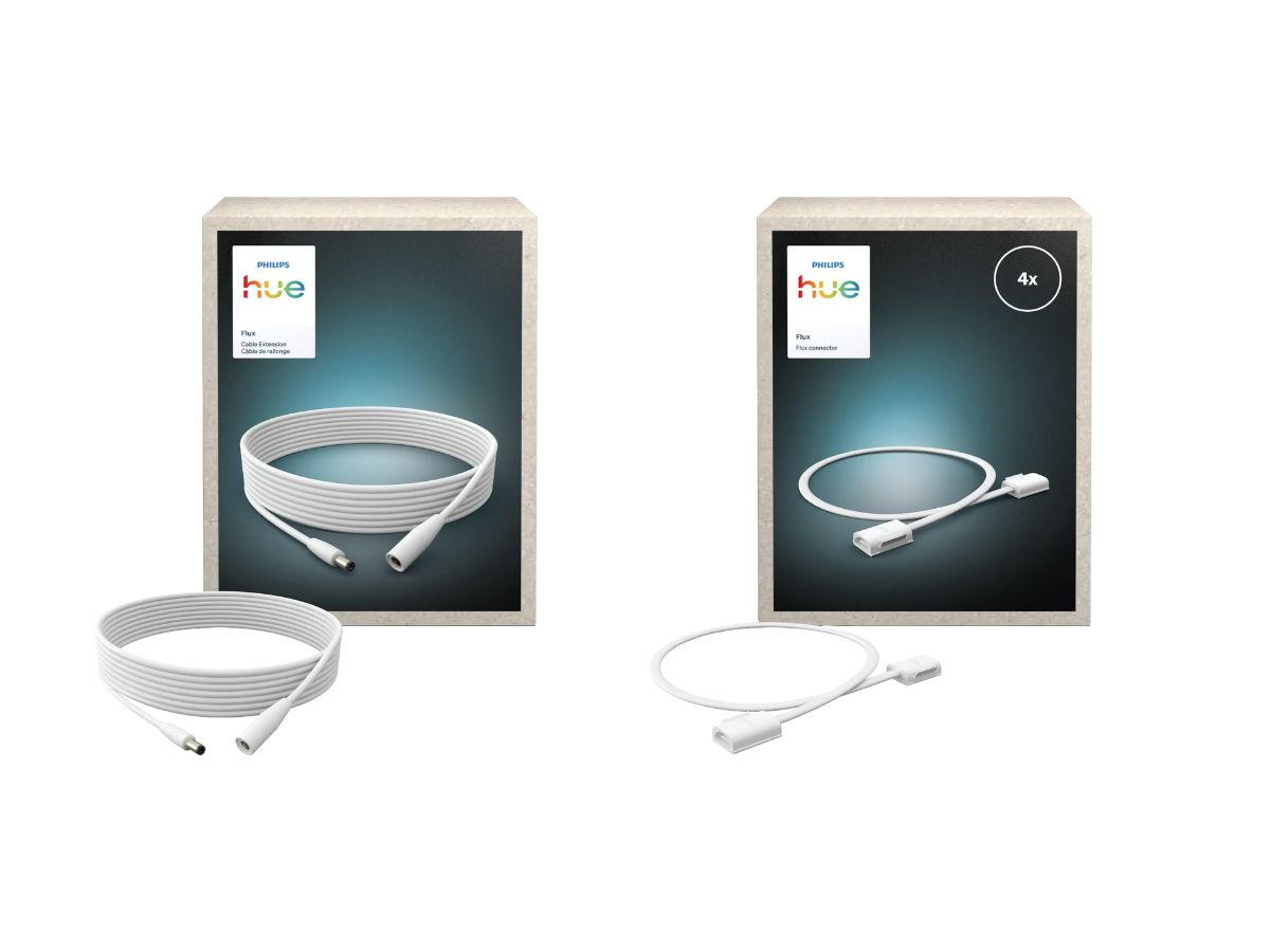 A Hue Flux csatlakozó I alakú, míg a Flux sarokcsatlakozó L alakú. Mindkettő a Flux fénycsík darabjainak összekapcsolására használható, hogy hosszabb hosszúságot hozzon létre. A Flux Flex Connector egy alternatív módja két nagy távolságban lévő fénycsíkszakasz összekötésének, bár ez a világításban szünetet okoz. A Flux kábelhosszabbító lehetővé teszi, hogy a lámpákat az áramforrástól nagyobb távolságra helyezzük el. Ráadásul a Flux rögzítő konzol segítségével a fénycsíkot falra vagy mennyezetre rögzítheti, átlátszó klipszes kialakítással.