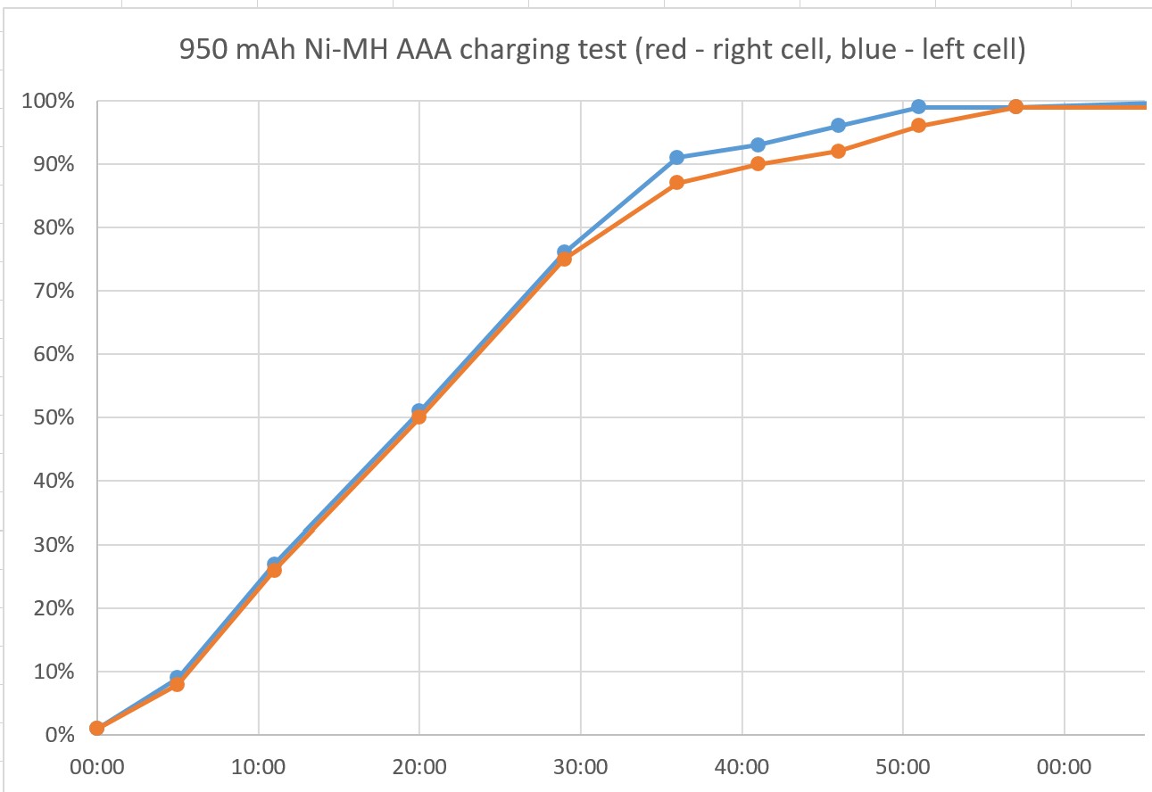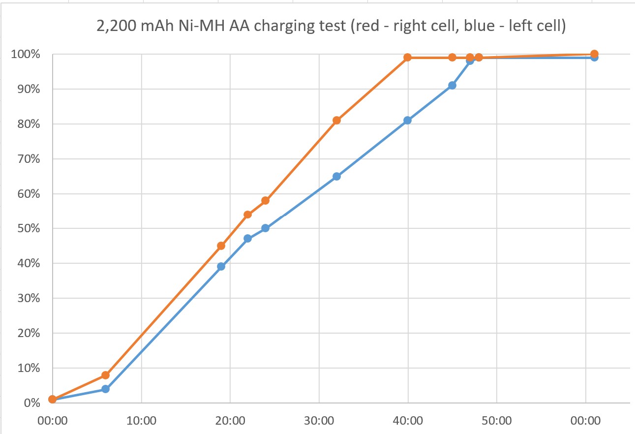Az AA-párok töltési sebessége feltűnően egyenetlen volt, az egyik cella gyorsabban töltődött, mint a másik. Párok töltésekor a gép nem dobja ki azt a cellát, amelyik előbb végzett. A feltöltött cellák enyhén melegek voltak.