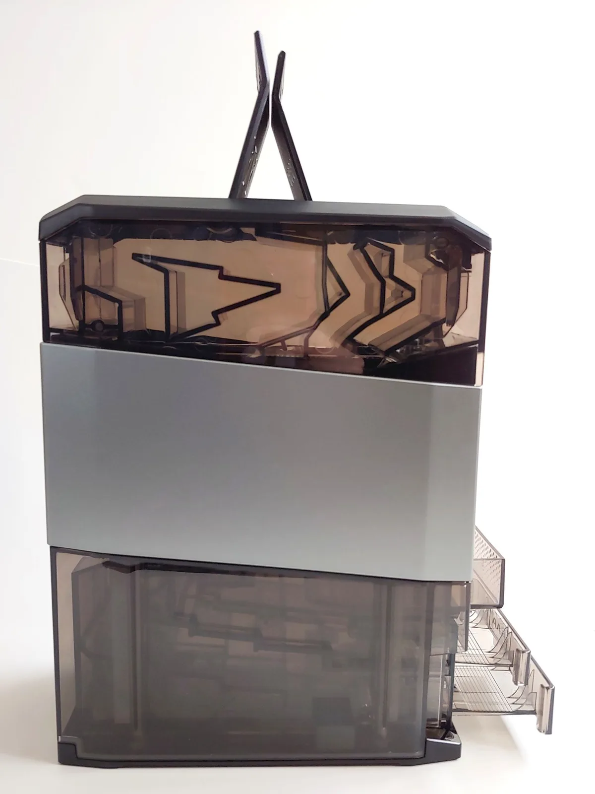 A töltő torony kialakítású. Az akkumulátorok betöltése felülről történik, míg a feltöltött és rossz cellák az elöl található tálcákba kerülnek. A gép minden egyes indításkor akár több percig is kavarog, hogy ellenőrizze a tápokban lévő cellákat és a töltőpárokat elemzés és töltés céljából. A gépben minden típusból legfeljebb 12 feltöltött elem tárolható, és az AA és AAA tálcák úgy vannak kialakítva, hogy minden egyes alkalommal, amikor kinyitják őket, egyszerre két elemet dobjanak ki. A rossz cellák tálcája nem rendelkezik ezzel a korlátozással.