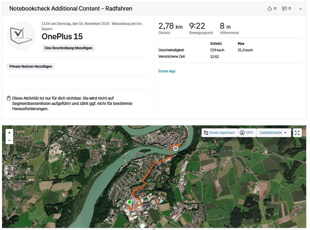 Mindkét készülék pontosan ugyanazt a távolságot számolta ki, és a OnePlus 15 pontosan ábrázolta az útvonalunkat. A hídon néhány méterrel eltértünk a tényleges útvonalunktól, de összességében a telefon nagyon jól használható navigációra és helymeghatározásra.