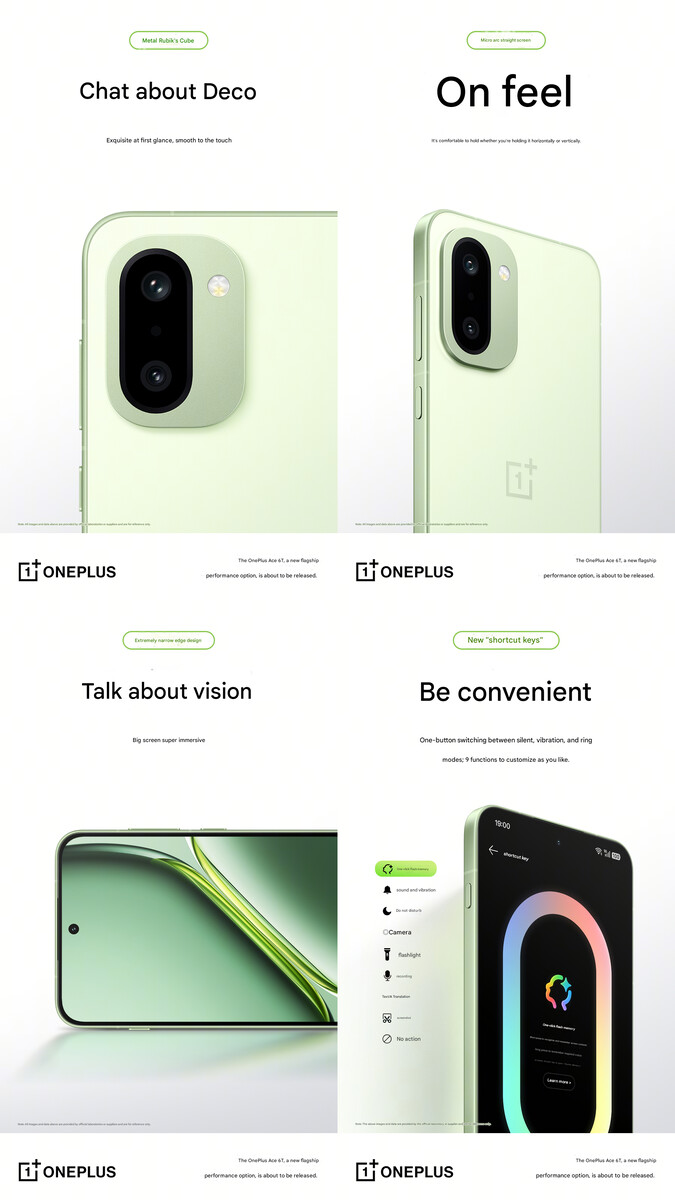 Ezen kívül a fotók megerősítették, hogy a OnePlus Ace 6T hátoldalán dupla kamera beállítással érkezik, hasonló kinézetű kameraszigettel, mint a OnePlus 15. Bár a márka még nem erősítette meg, ez a két várhatóan 50 MP-es szenzorok. A vállalat ugyanakkor megerősítette, hogy a telefon egyenes kijelzővel és könnyű felépítéssel fog rendelkezni.